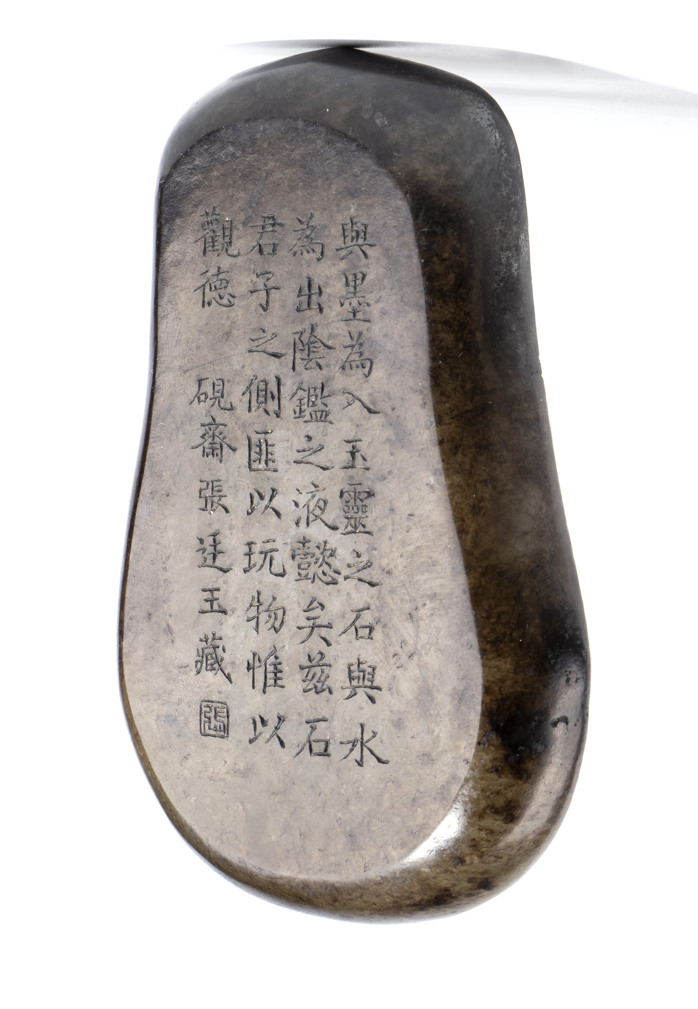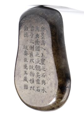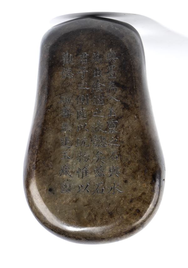 Pietra da inchiostro in giada scura; sulla base è incisa una poesia.