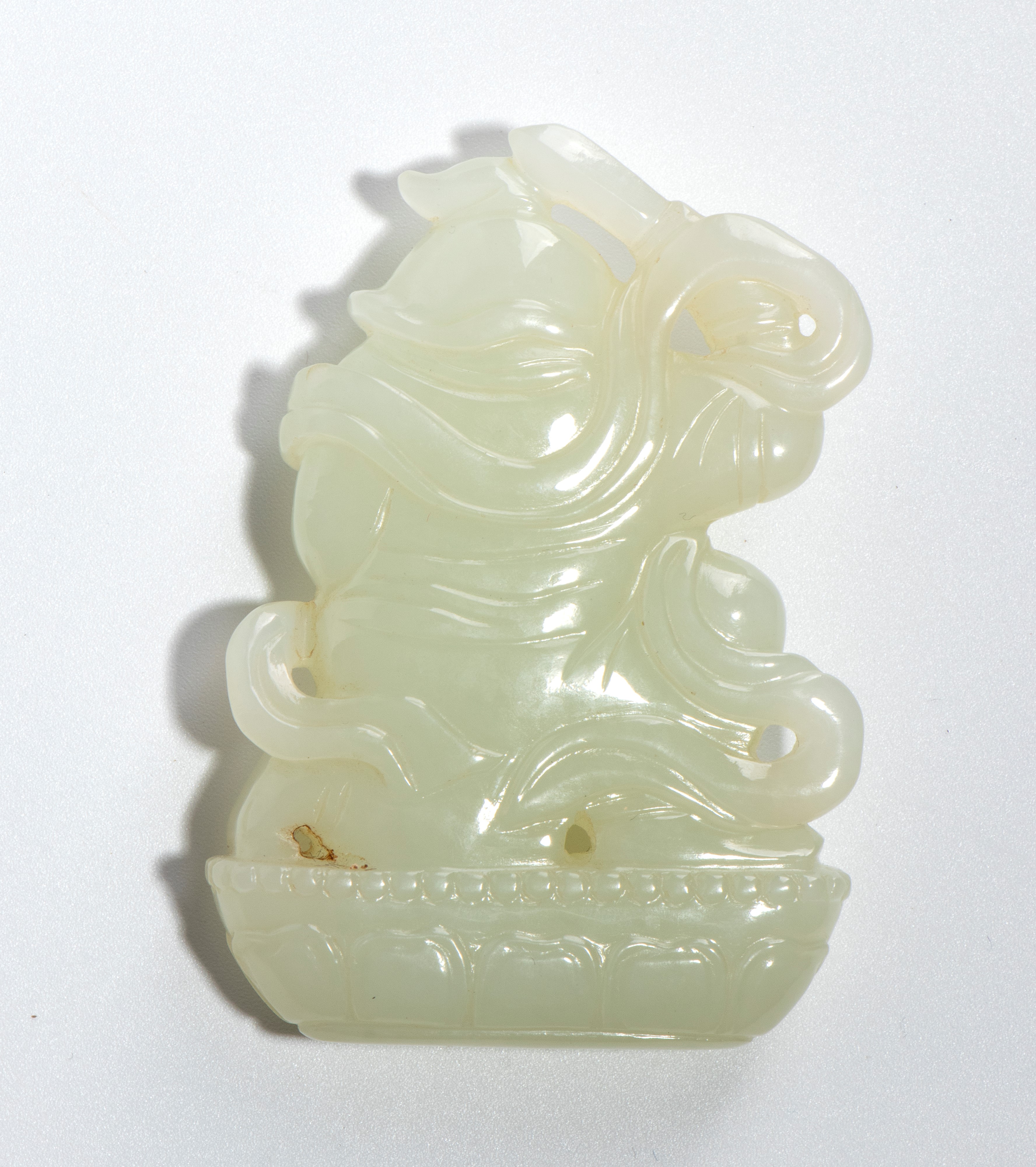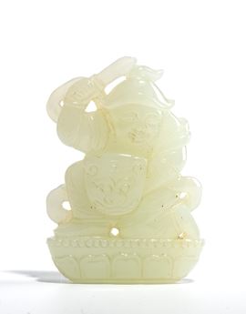 Placca in giada bianca raffigurante un  militare di alto rango.Il significo è il superamento degli ostacoli per raggiungere il successo.