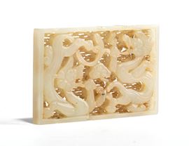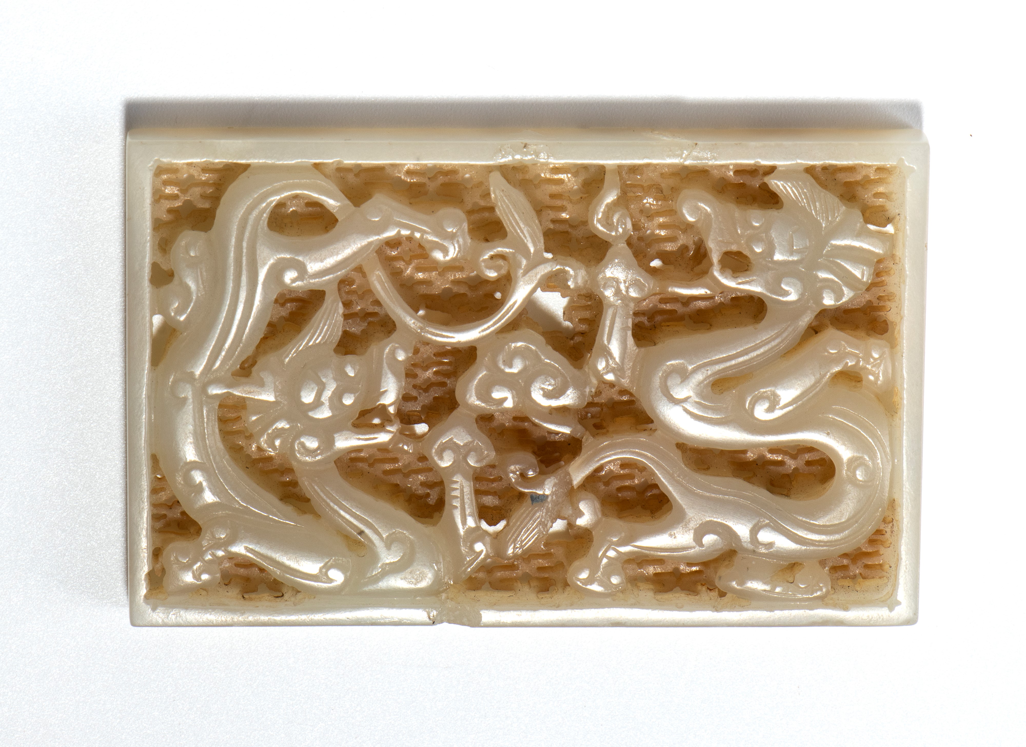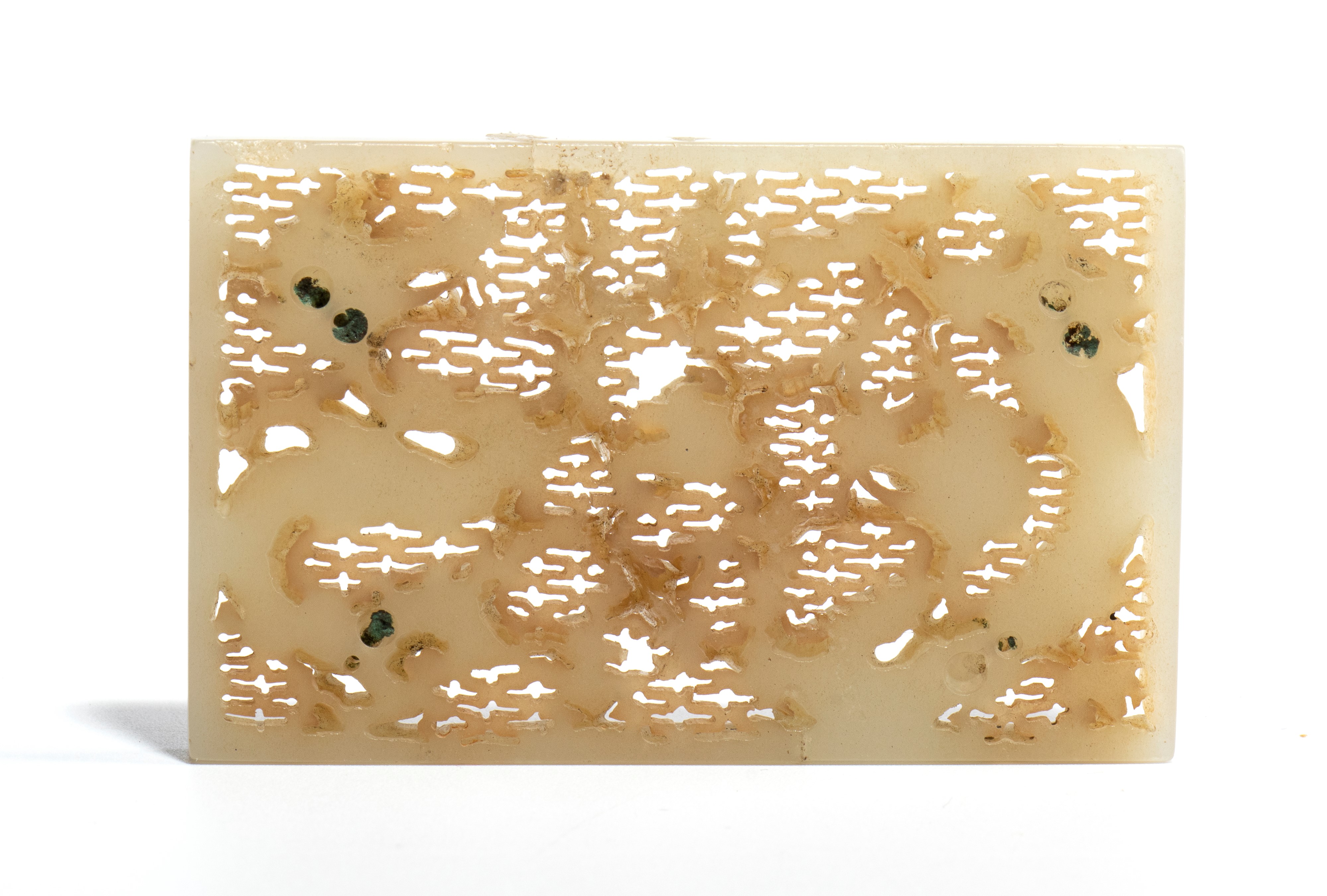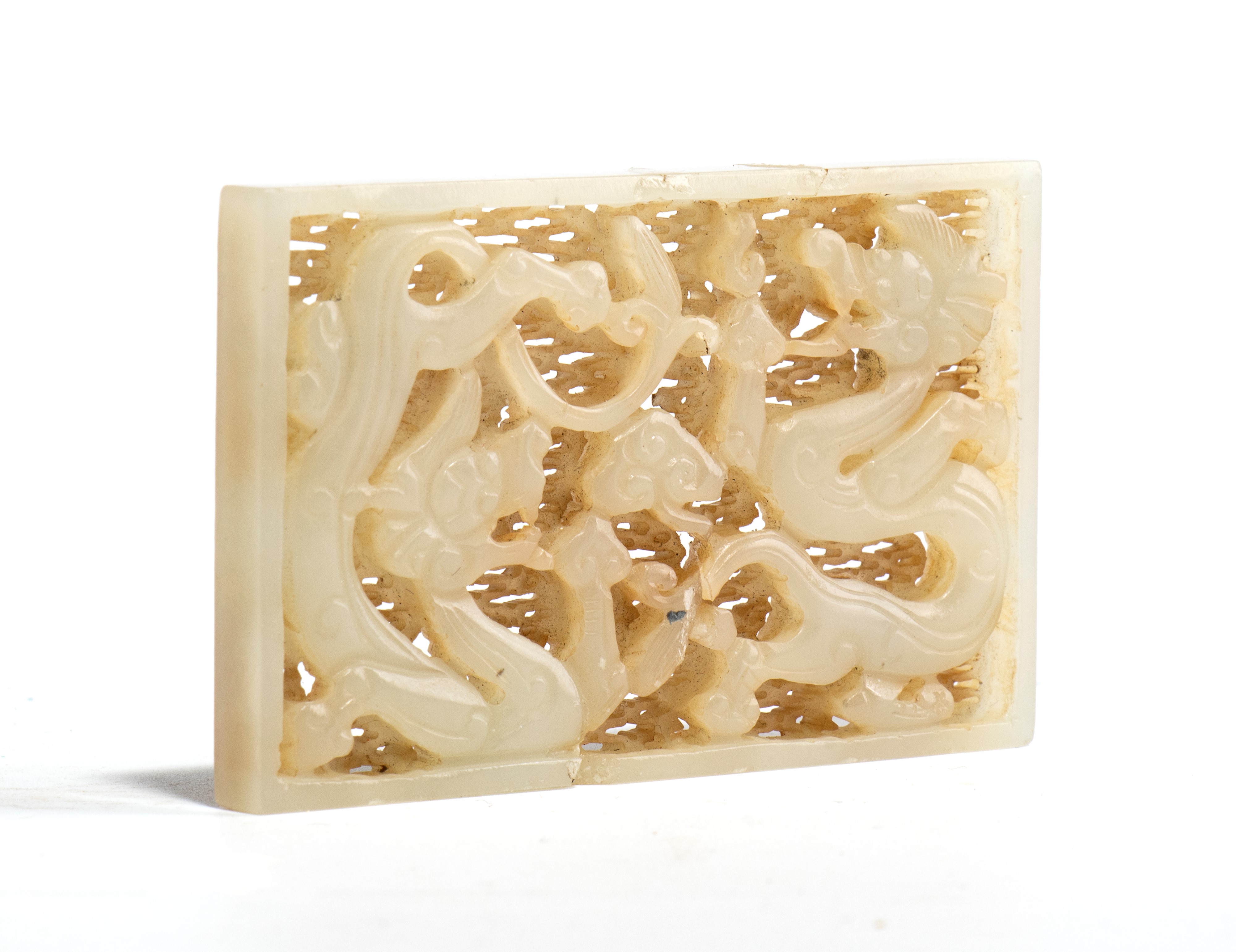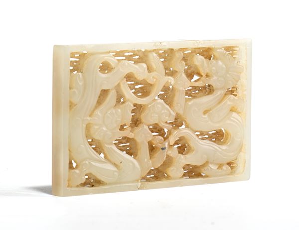 Placca in giada lavorata a traforo, decorata a rilievo con drago.