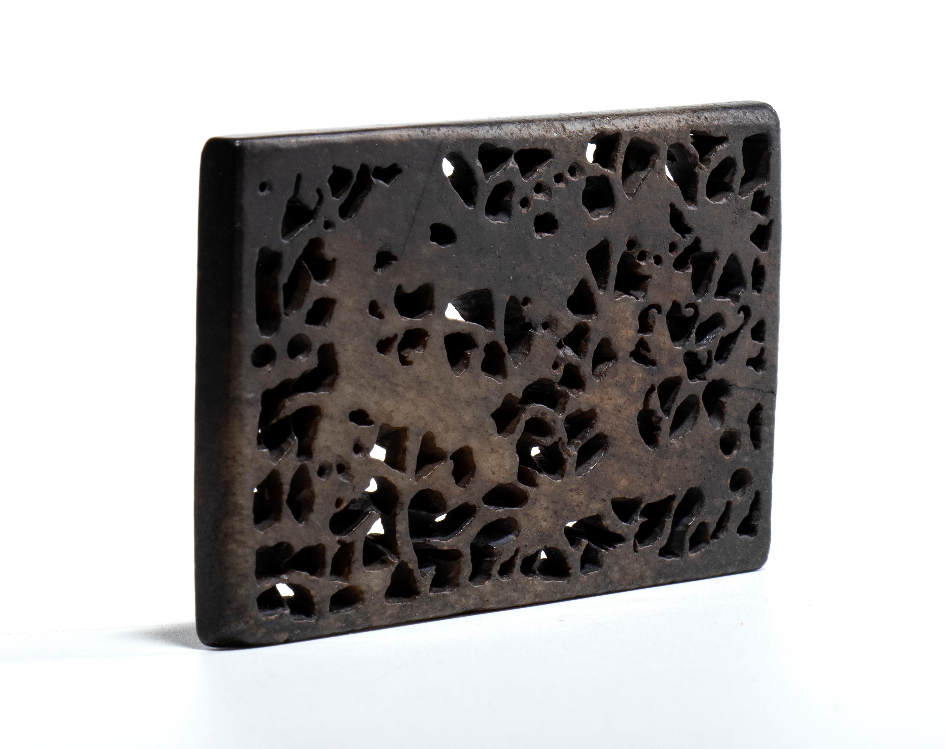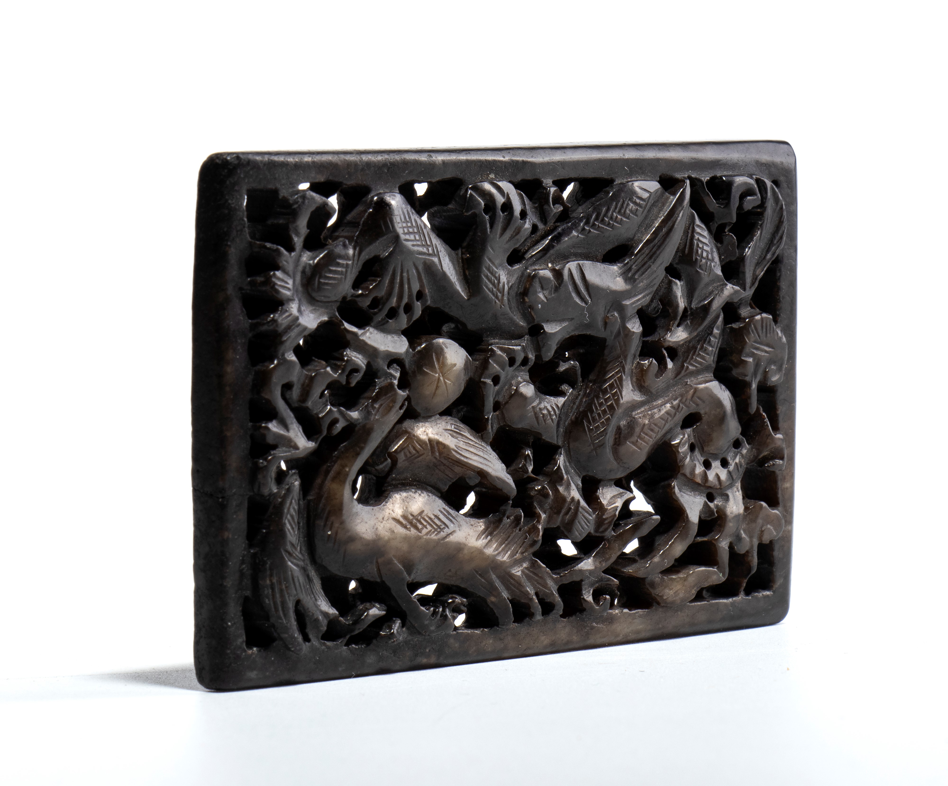 Placca in giada scura lavorata a traforo decorata con drago e fenice.