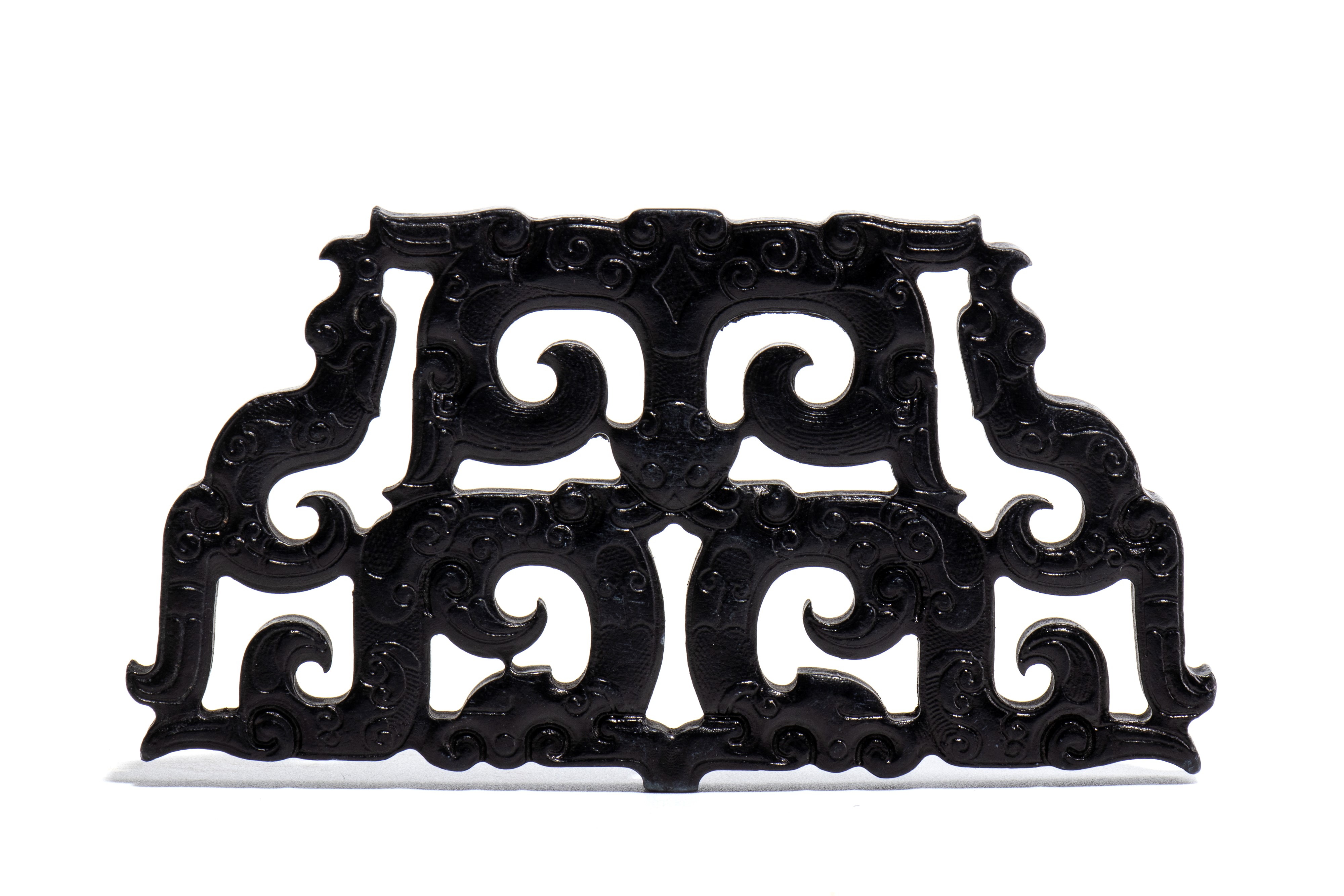 Placca in giada scura lavorata a traforo con decoro di draghi arcaici in stile della dinastia Han (206a.c-220D.c).