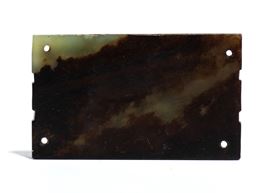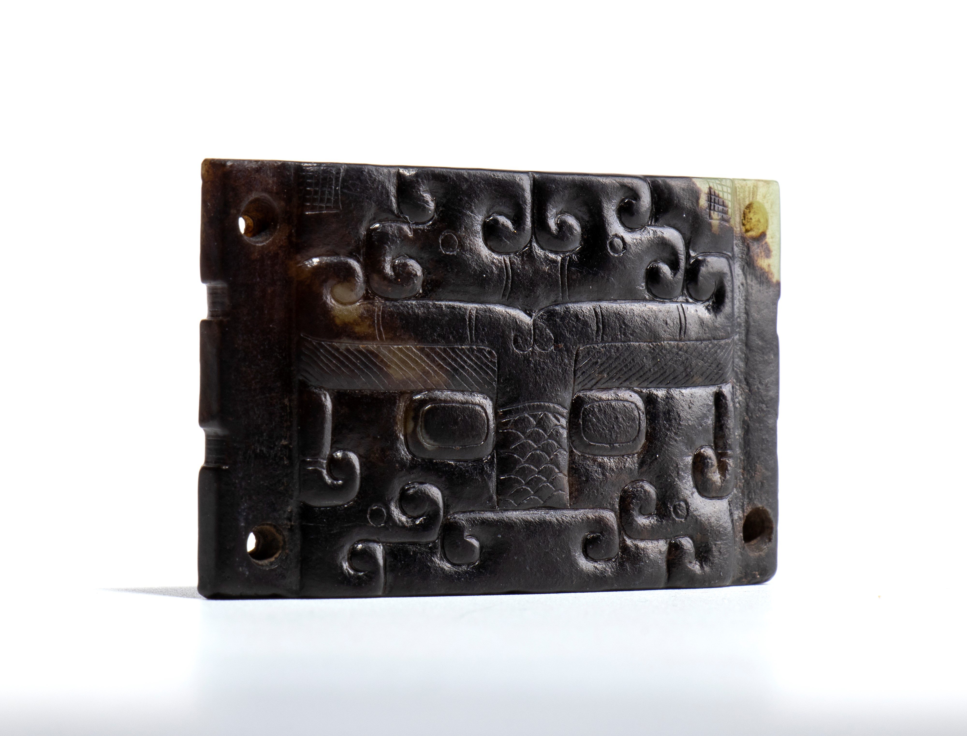 Placca in giada scura decorata a leggero rilievo con motivi di Taotie incisi.