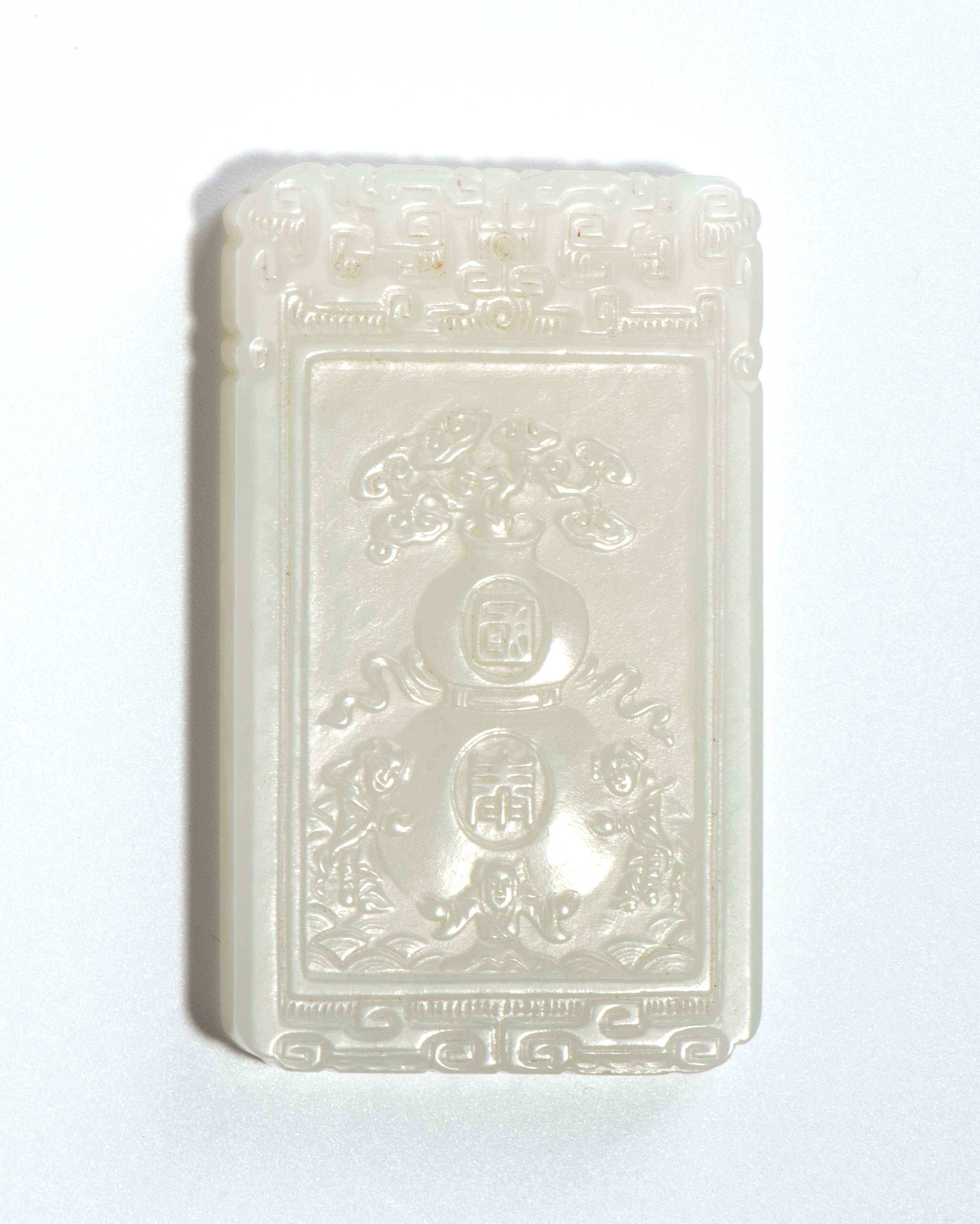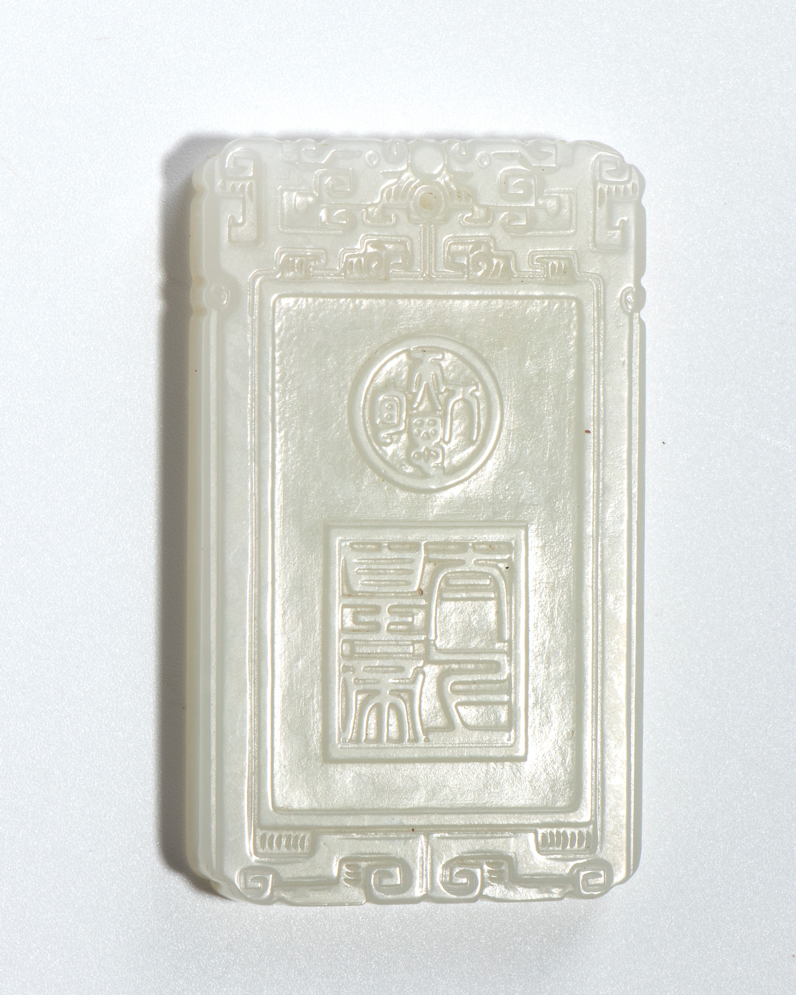 Placchetta rettangolare in giada bianca  decorata a leggero rilievo con il tema "Fu Lu" (che significa Benedizioni e Prosperità). Sulla faccia anteriore sono incise le due parole "Guo Tai" (Nazione Pacifica), mentre sulla faccia posteriore appaiono le frasi "Tian En Ba Xun" (Grazia Celeste per Ottanta Anni) e "Tai Shang Huang Di" (Imperatore Supremo).