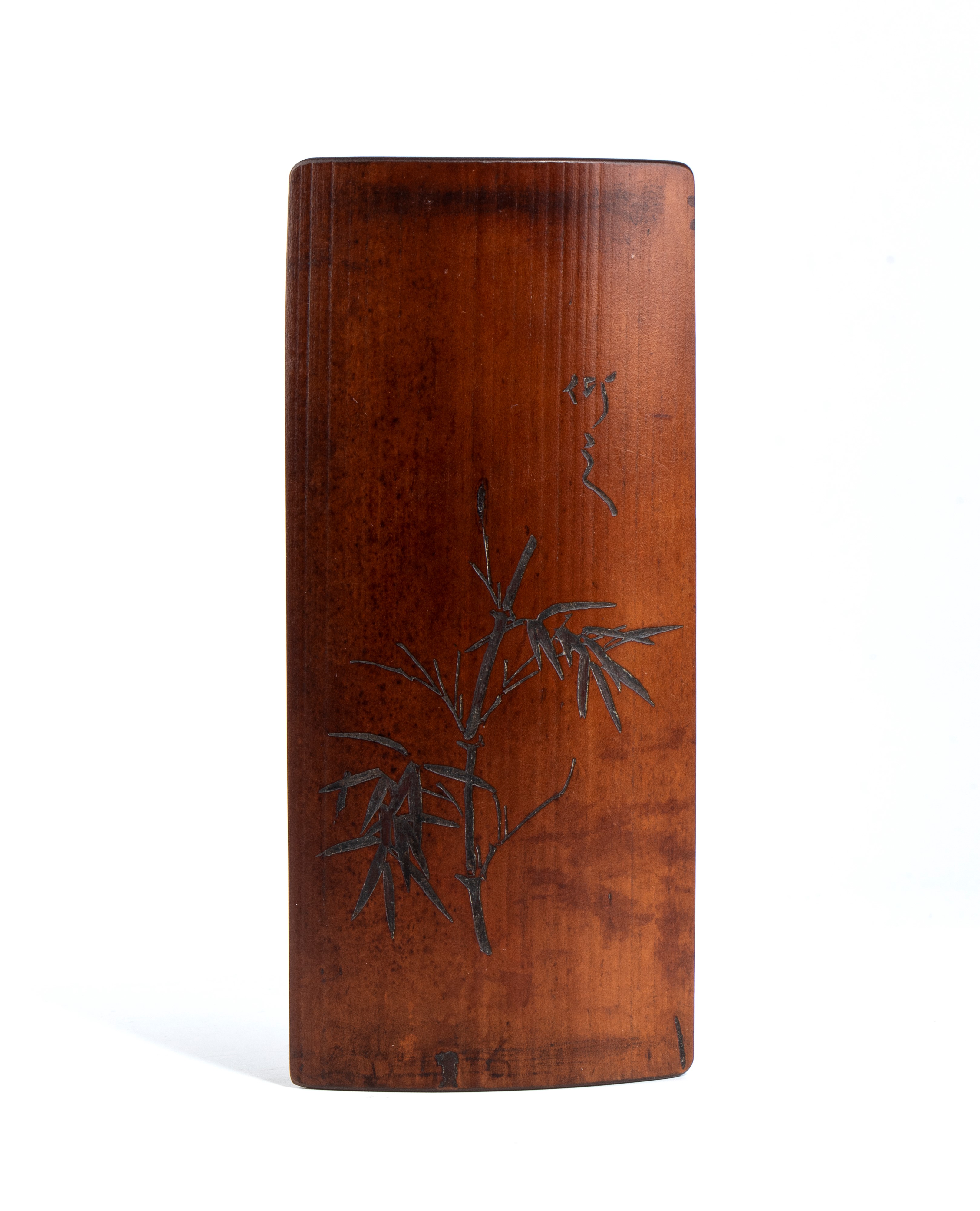 Porta-pennelli in bambù con decoro vegetale e caratteri cinesi.