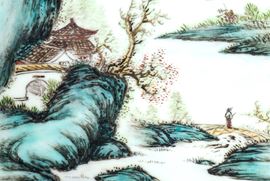 Raffinato set di tre formelle dipinta a smalti policromi con paesaggio n stile "acqua di montagna".