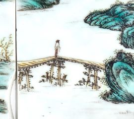 L'opera raffigura un sereno e nebbioso paesaggio montuoso con cascate, alberi e piccole figure che attraversano un ponte.