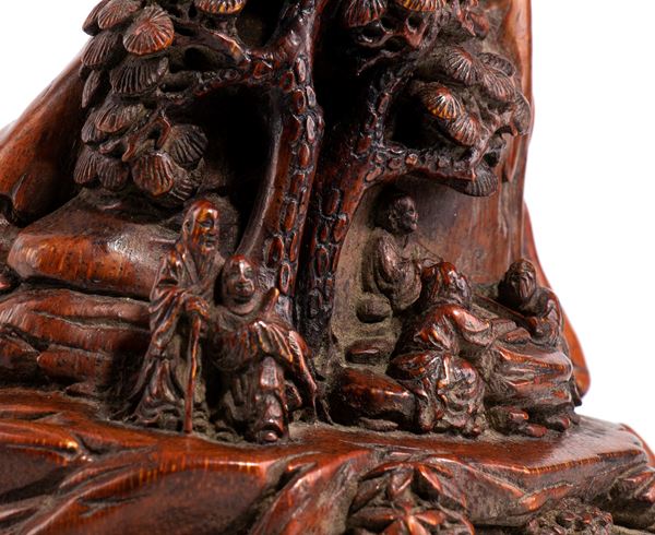 Scultura in radice di bambù raffigurante personaggi in un paesaggio classico cinese con montagna e alberi. La base è in legno.