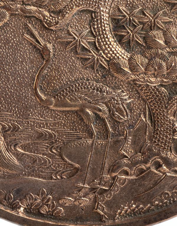 Specchio Kagami in bronzo decorato con il stemma del Samurai, gru e pino.
