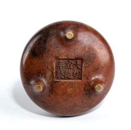 Un incensiere tripode In bronzo con marchio a sei caratteri "大明成化年制,damingchenghuanianzhi", dinastia Ming apocrifo.