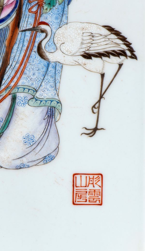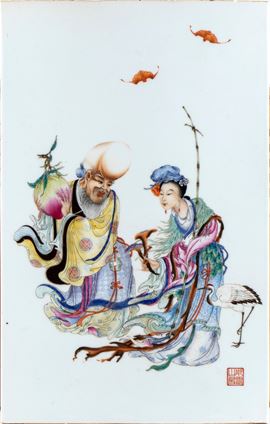 Una bella formella finemente dipinta a smalti policromi raffigurante il dio della longevità, Shouxing, che regge un bastone e una grande pesca, simbolo di immortalità accompagnato da He Xiangu con i suoi attributi. Firmato con iscrizione" 彤云山房,tongyunsanfeng".
