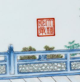 Una bella formella finemente dipinta a smalti policromi raffigurante due bellezze in un giardino. Firmata con iscrizione  "番禺侯氏所藏-panyu hou  she suo can".