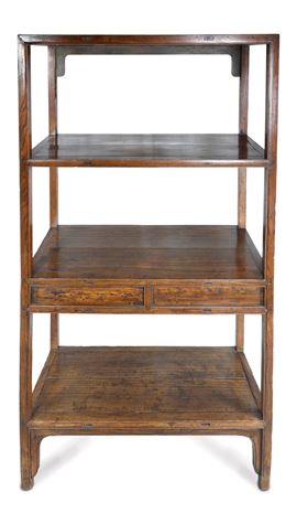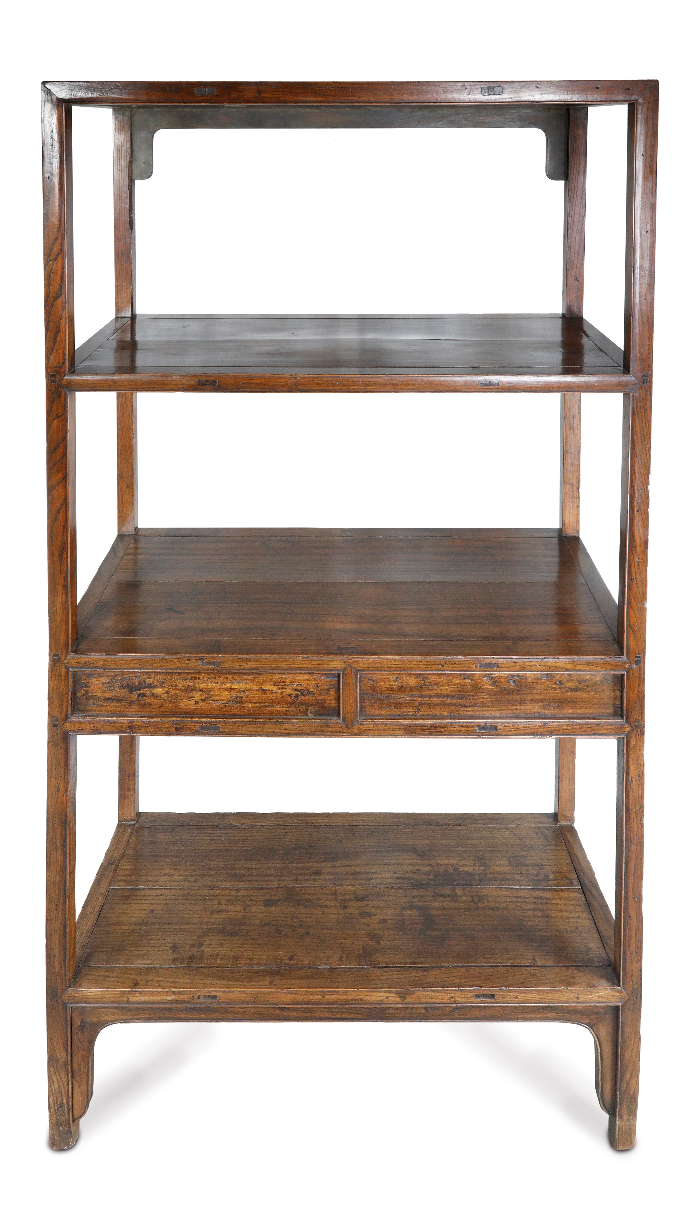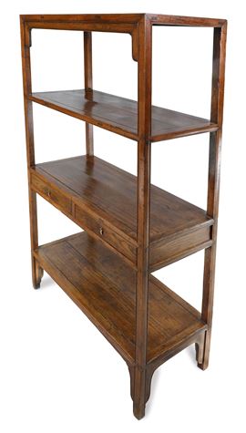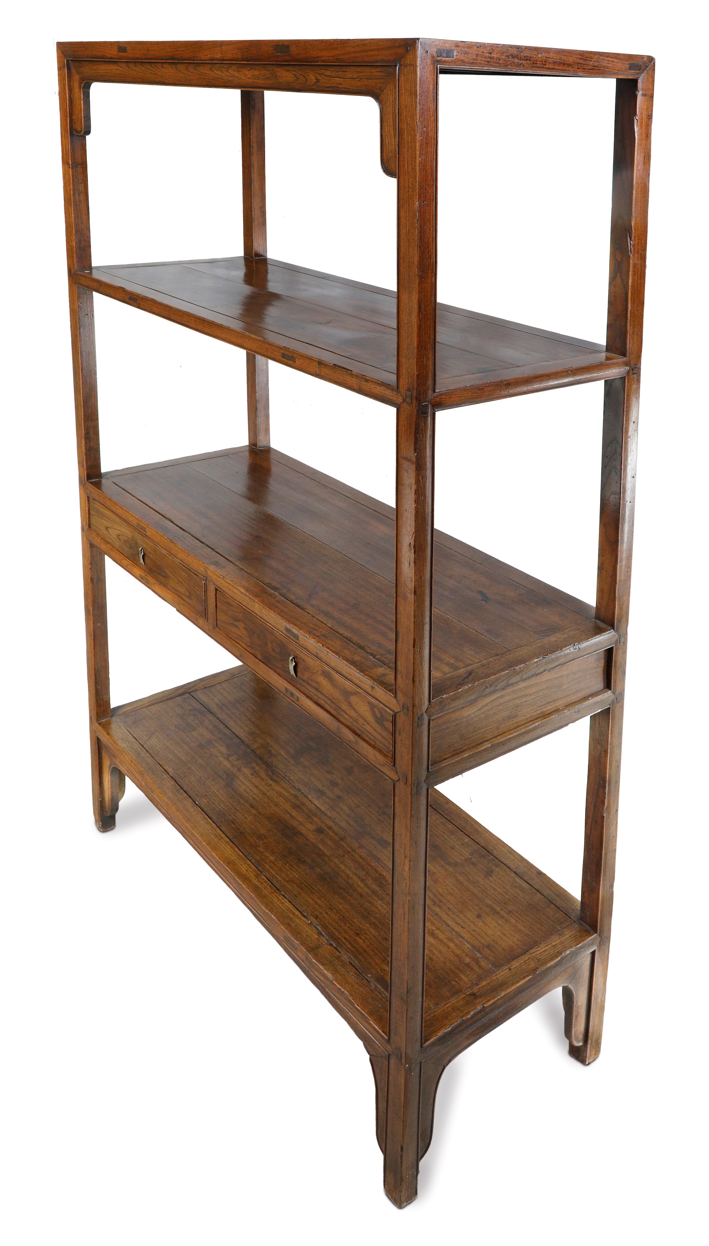 Una rara libreria aperta della Provincia dello Jiangsu in legno di Jumu disproporzioni rimarchevoli. La parte frontale degli elementi strutturali è arricchita da una semplice modanatura sullo spigolo che crea una forma distinta sul profilo. I pannelli degli scaffali sono anch'essi in Jumu e lo scaffale centrale incorpora due cassetti con maniglie pendente. La superficie conserva una buona patina ed un ricco colore dei toni del miele associati ad un Jumu di qualità.La parte superiore ha grembiuli e profili, ma il pezzo è scevro da inutile barra lasciando solo linee aperte che sono più gradevoli all'occhio.