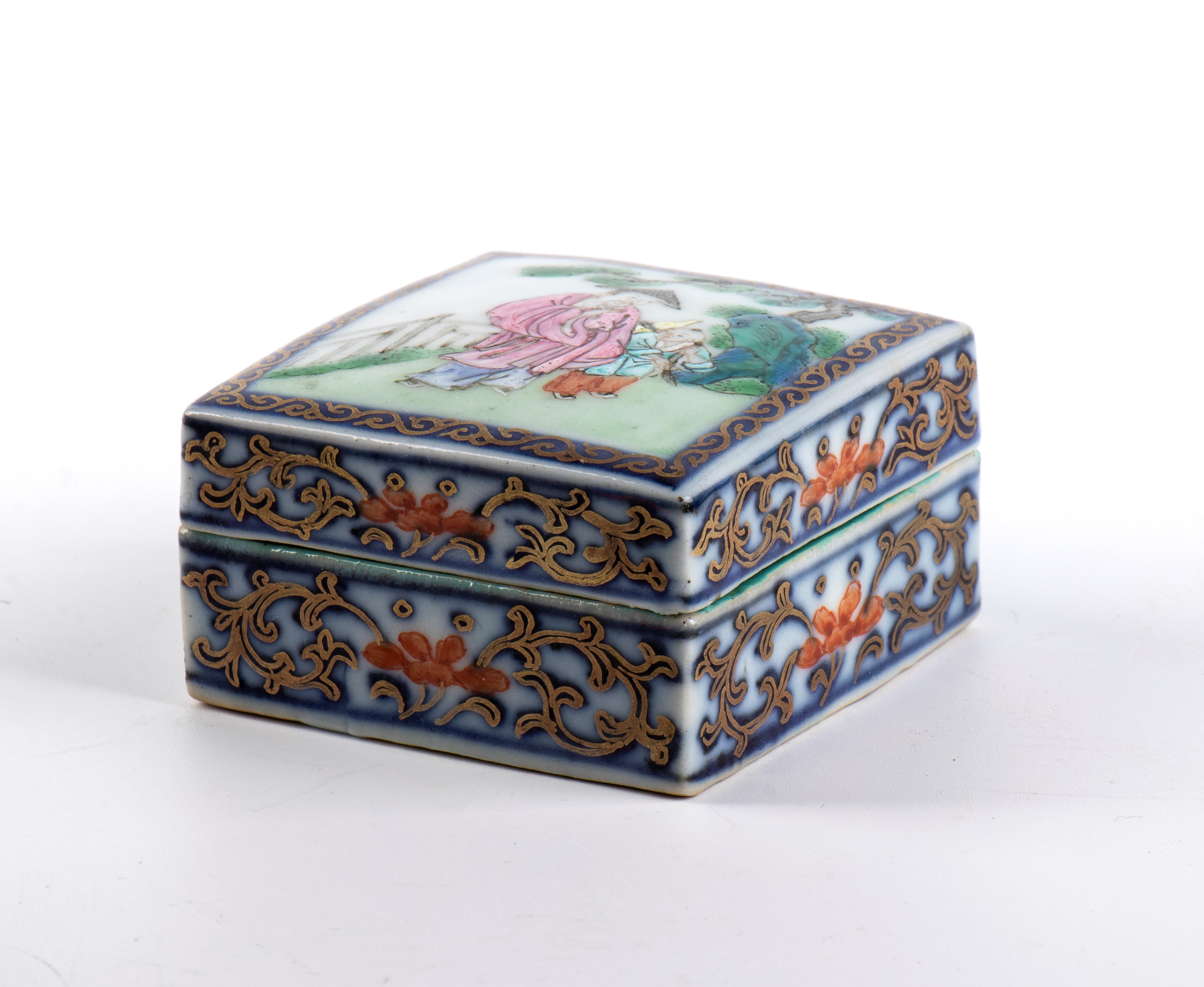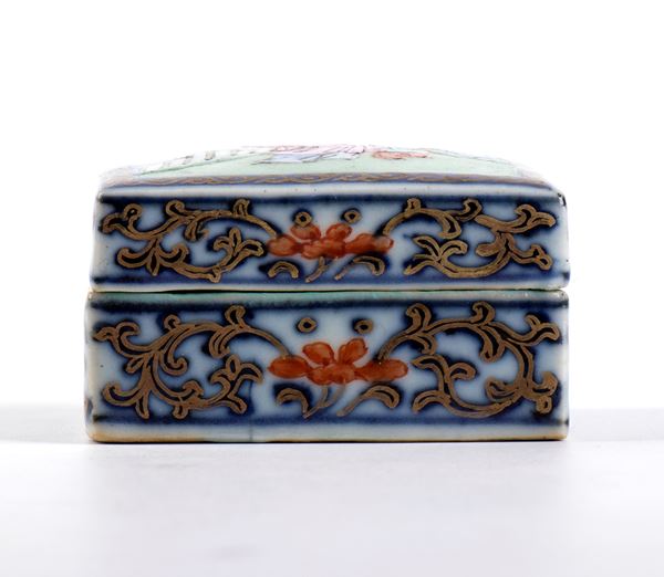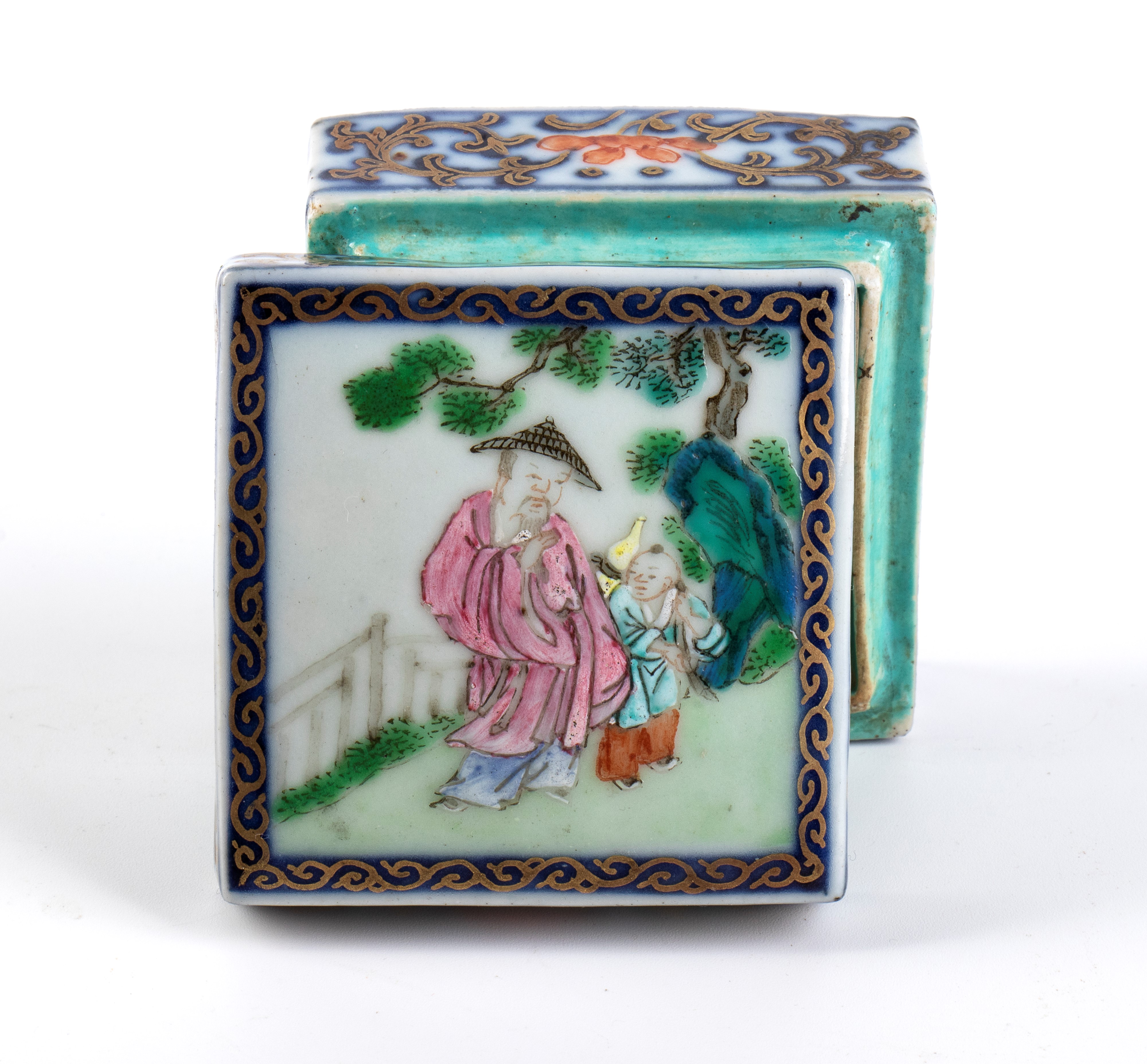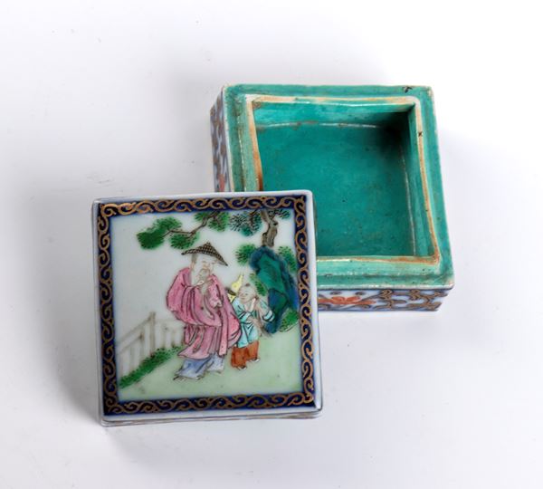 Una rara scatola in porcellana famiglia rosa con una scena dipinta a mano sul coperchio che raffigura un anziano e un bambino in un giardino. La scatola è decorata con un bordo blu e oro e un motivo floreale sui lati.