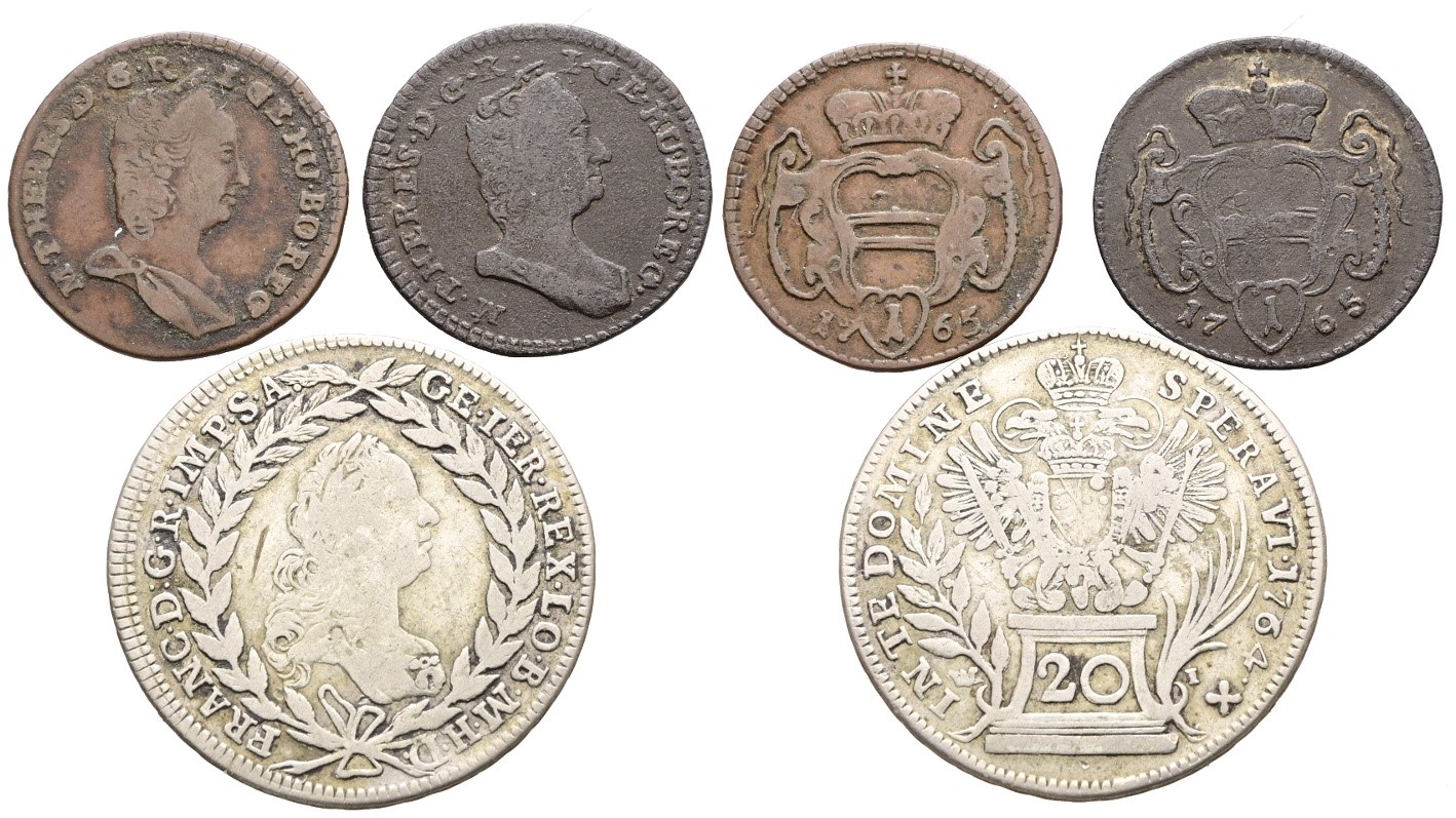 AUSTRIA. Maria Teresa d'Asburgo (1740-1780). Interessante lotto d 3 monete da 1 pfennig 1765 Cu, 20 kreuzer 1764 Ag. Conservazioni varie.
