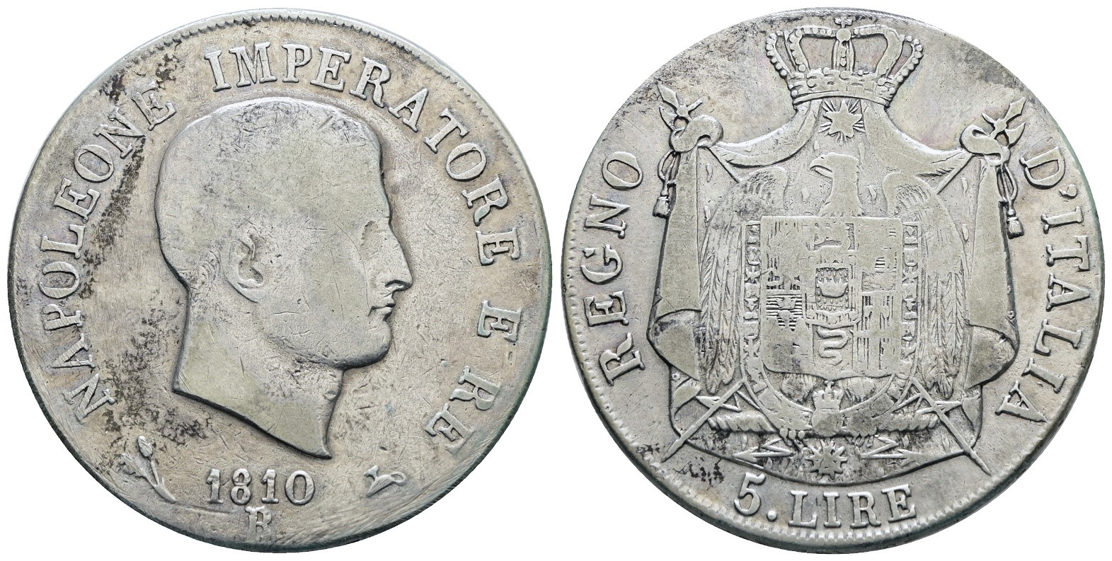 BOLOGNA. Regno d'Italia. Napoleone I (1805-1814). 5 lire 1808. Ag; 25gr; Gig.101; Raro; MB+