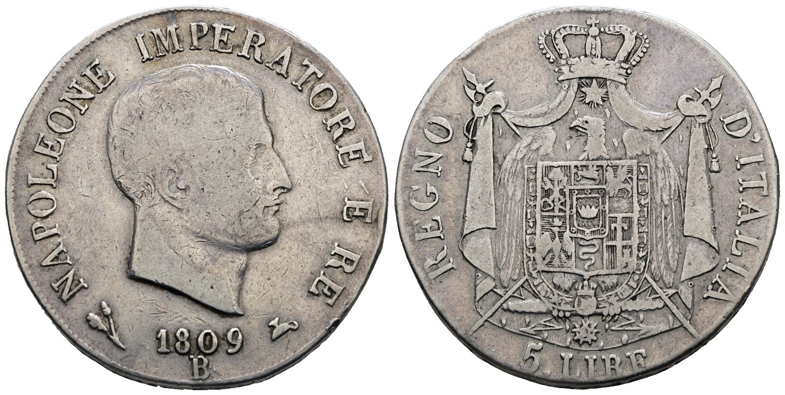 BOLOGNA. Regno d'Italia. Napoleone I (1805-1814). 5 lire 1809. Ag; 25gr; Gig.99; Raro; MB/BB
