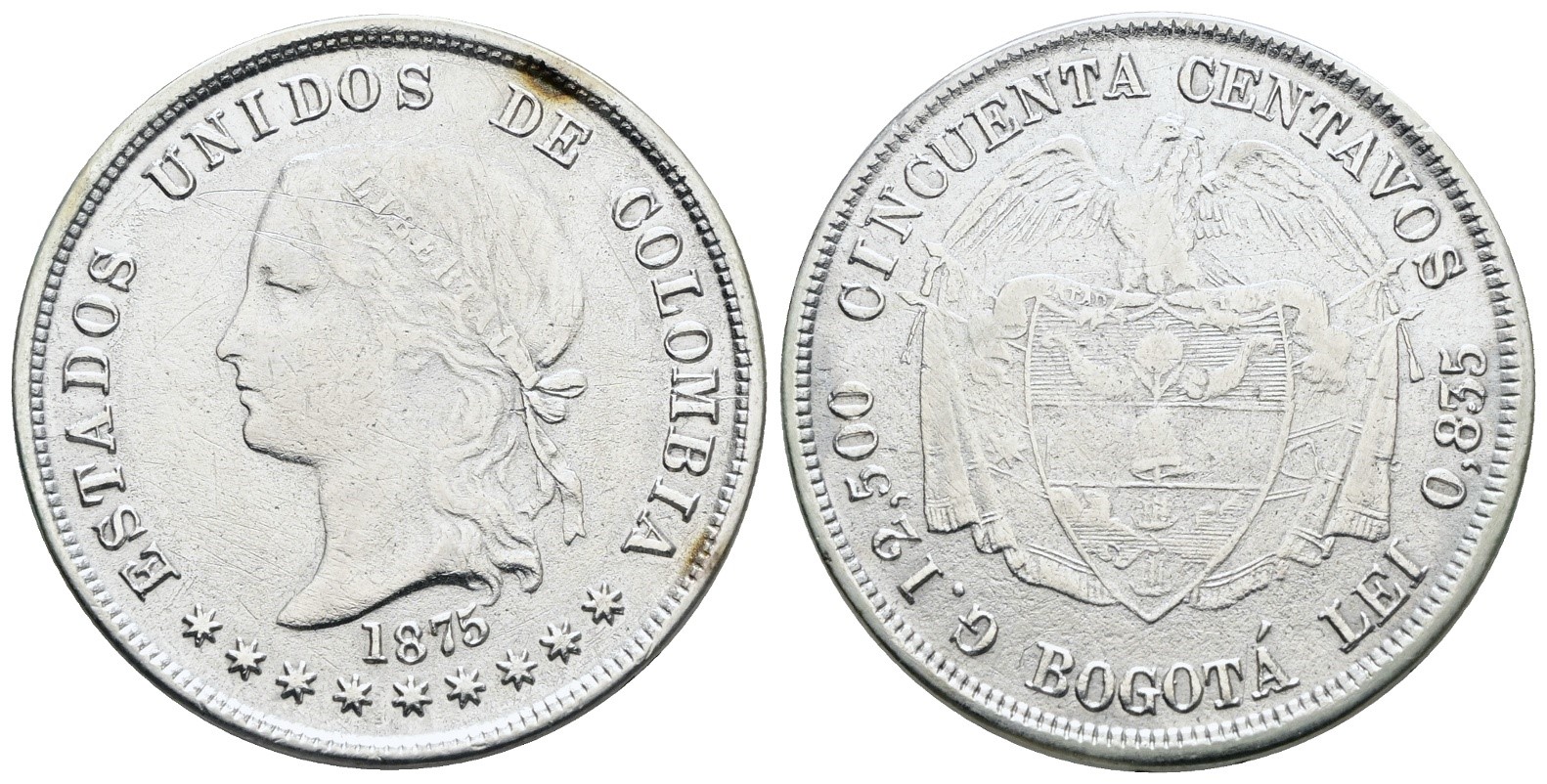 COLOMBIA. 50 centavos 1875. Ag; 12,5gr; KM 177; BB