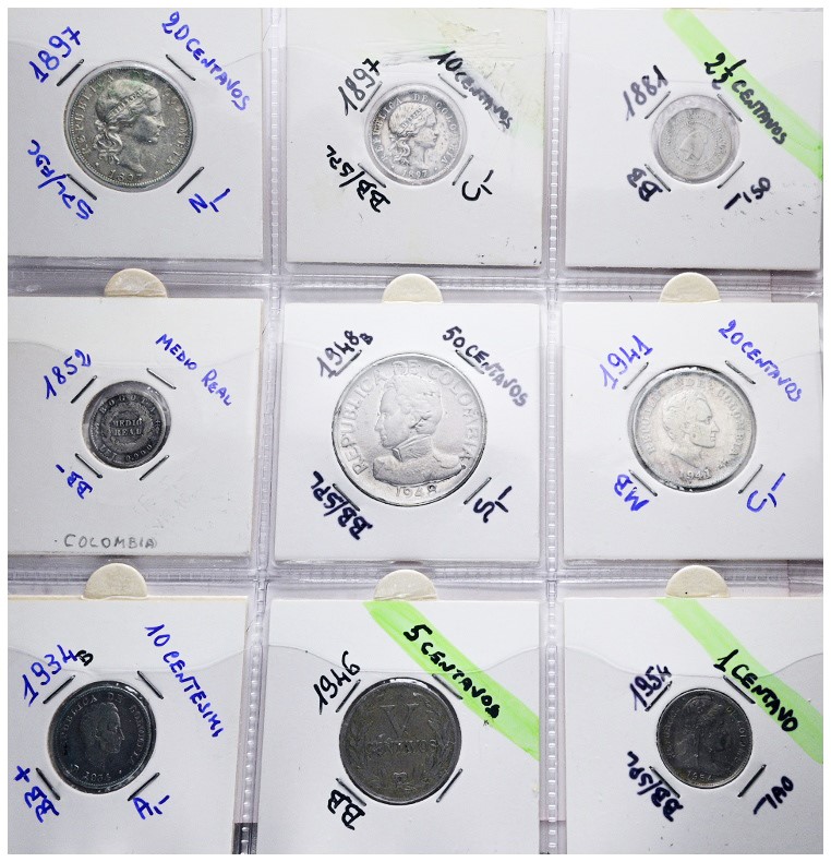 COLOMBIA. Lotto di 9 monete. Nominali, metalli, date e conservazioni varie.
