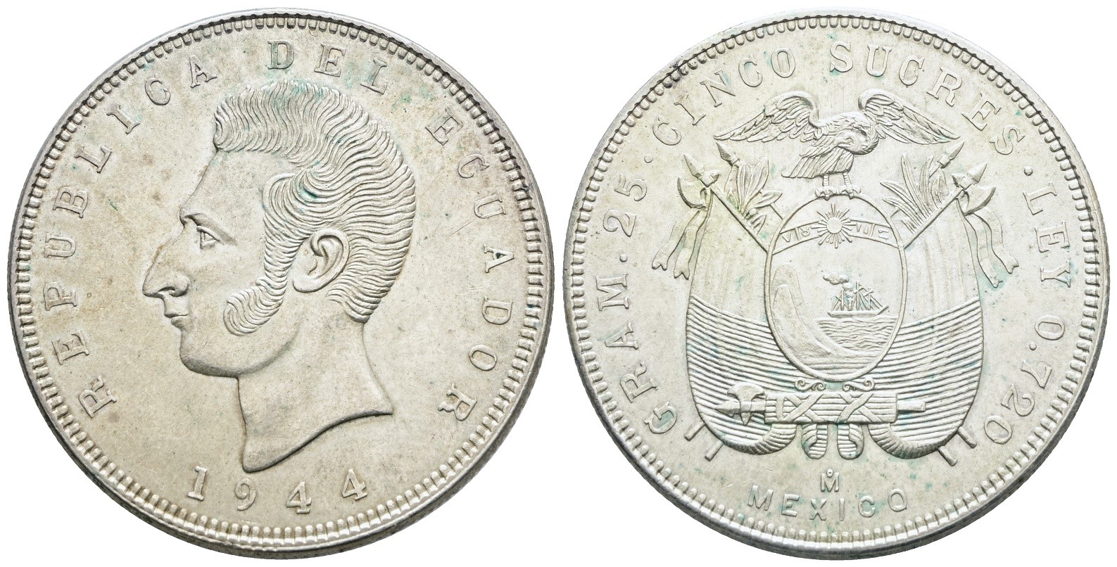 ECUADOR. 5 sucre 1944. Ag; 25gr; KM 79; SPL