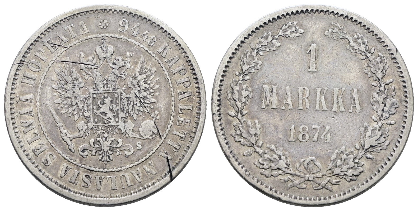 FINLANDIA. Alessandro II (1855-1881). 1 markka 1874. Ag; 5,18gr; KM 3.2; BB, graffio al d.