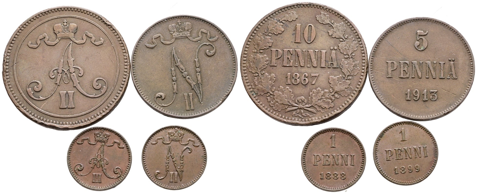 FINLANDIA. lotto di 4 monete da 1, 5, 10 pennia. Cu; Date e conservazioni varie.