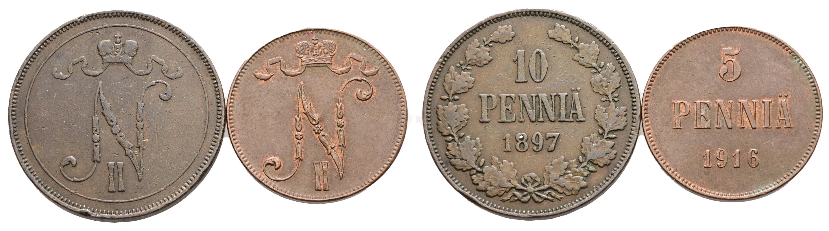 FINLANDIA. Nicola II (1894-1917). Lotto di 2 monete da 10 pennia 1897, 5 pennia 1916. Cu. Conservazioni varie.
