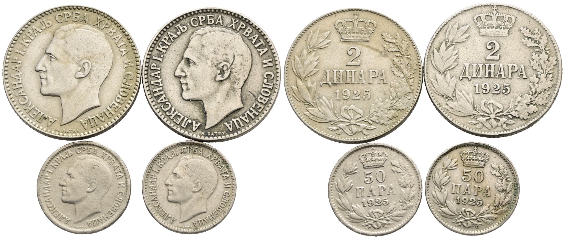 JUGOSLAVIA. Alessandro I (1918-1941). Lotto di 4 monete da 2 dinari e 50 para 1925. Cu; Conservazioni varie.