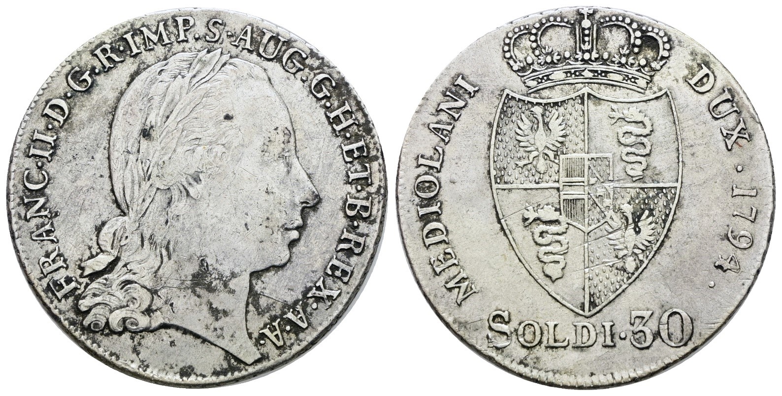 MILANO. Francesco II d'Asburgo (1792-1796). 30 soldi 1794. Ag; 7,3gr; Gig.16; MIR 466/1; Raro; BB, macchie