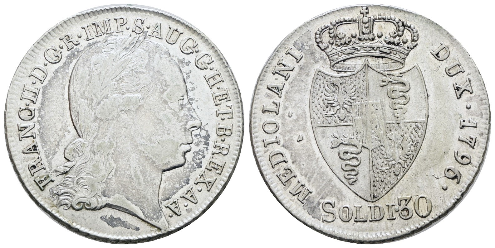 MILANO. Francesco II d'Asburgo (1792-1796). 30 soldi 1796. Ag; 7,3gr; Gig.18; MIR 466/3; BB
