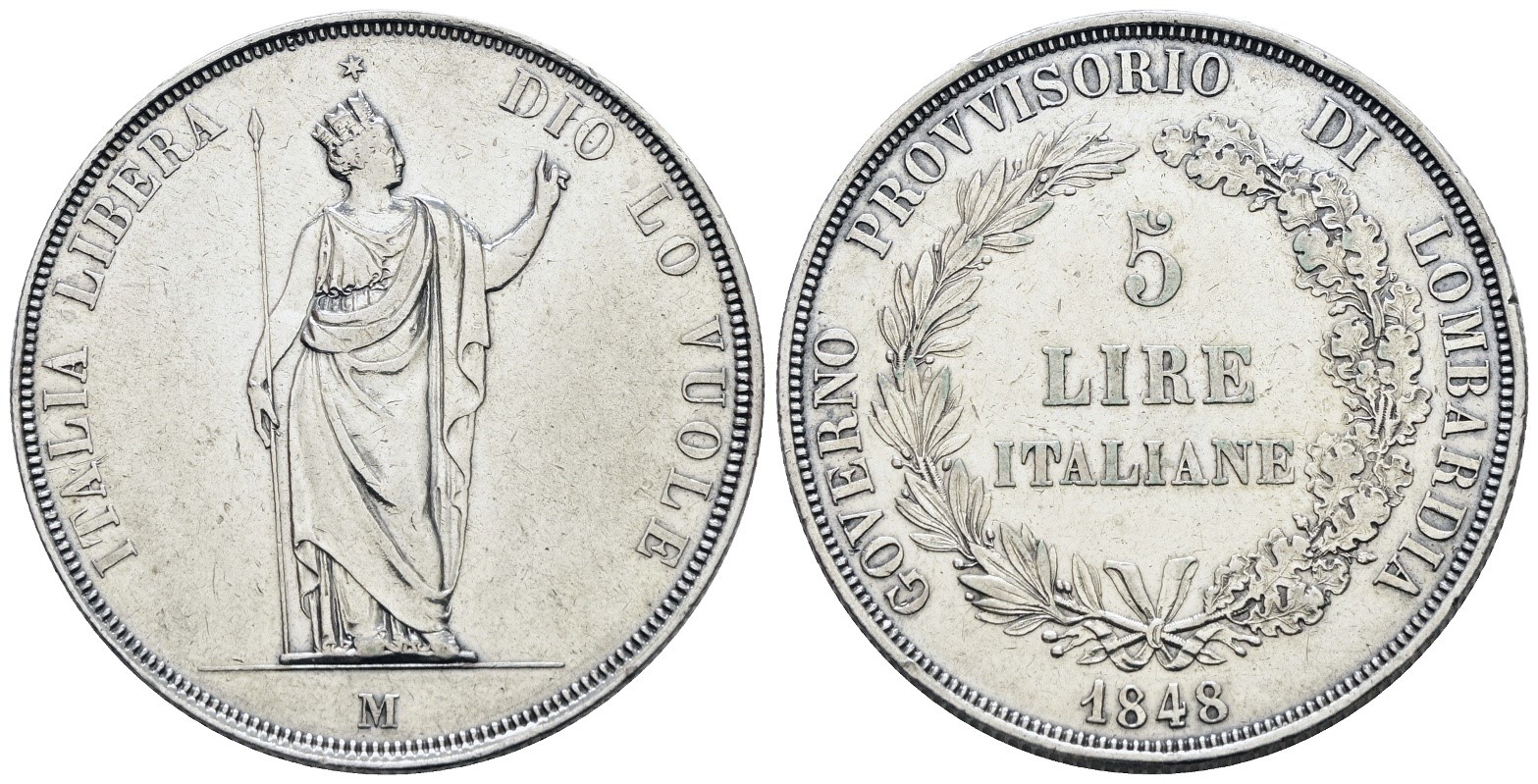 MILANO. Governo Provvisorio di Lombardia (1848). 5 lire 1848. Ag; 25gr; Gig.3; Q.SPL, bei rilievi, leggermente pulita.