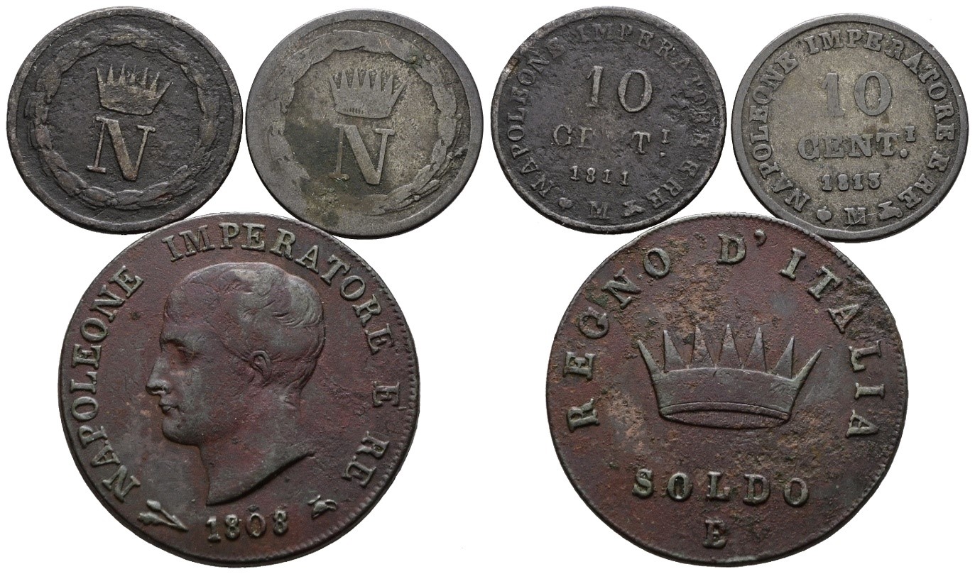 MILANO. Regno d'Italia. Napoleone I (1805-1814). Lotto di 3 monete; 10 centesimi; soldo; anni, metalli e conservazioni varie.