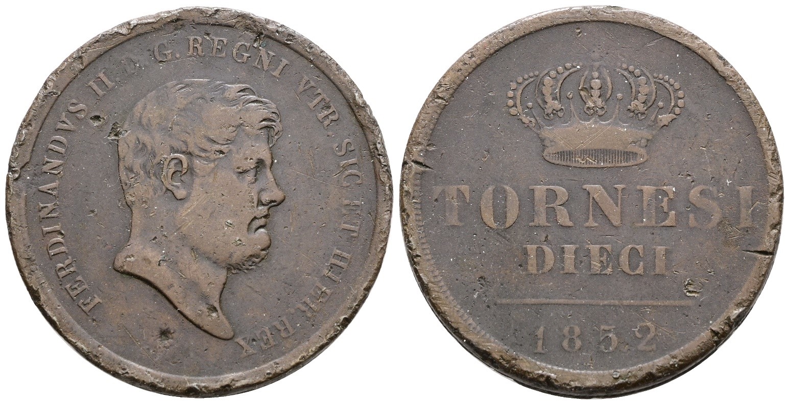NAPOLI. REGNO DELLE DUE SICILIE. Ferdinando II di Borbone (1830-1859). 10 tornesi 1852. Cu; 31,1gr; Gig.203; RR; MB, colpetti