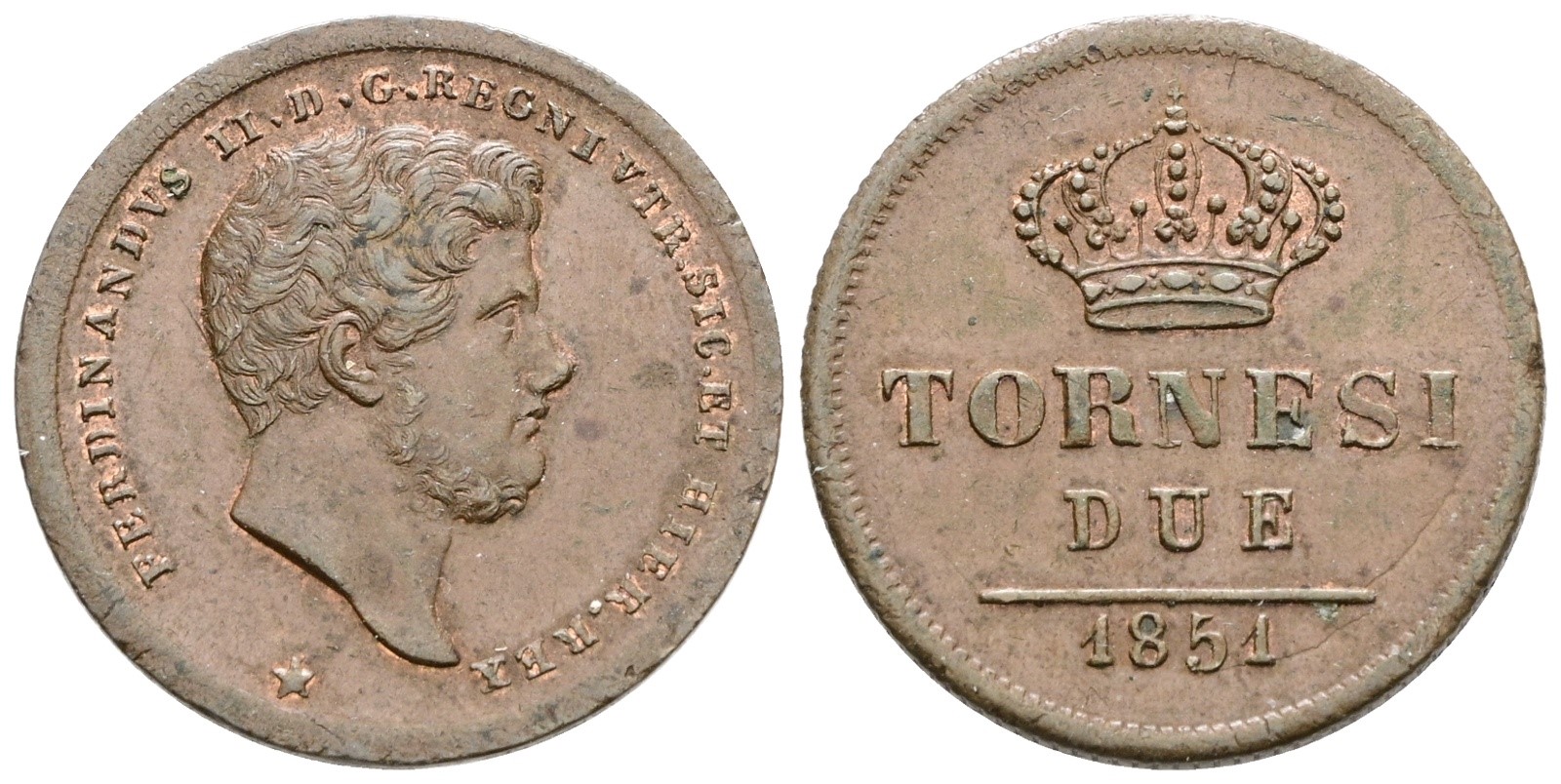 NAPOLI. REGNO DELLE DUE SICILIE. Ferdinando II di Borbone (1830-1859). 2 tornesi 1851. Cu; 6,2gr; Gig.255; NC; SPL/FDC