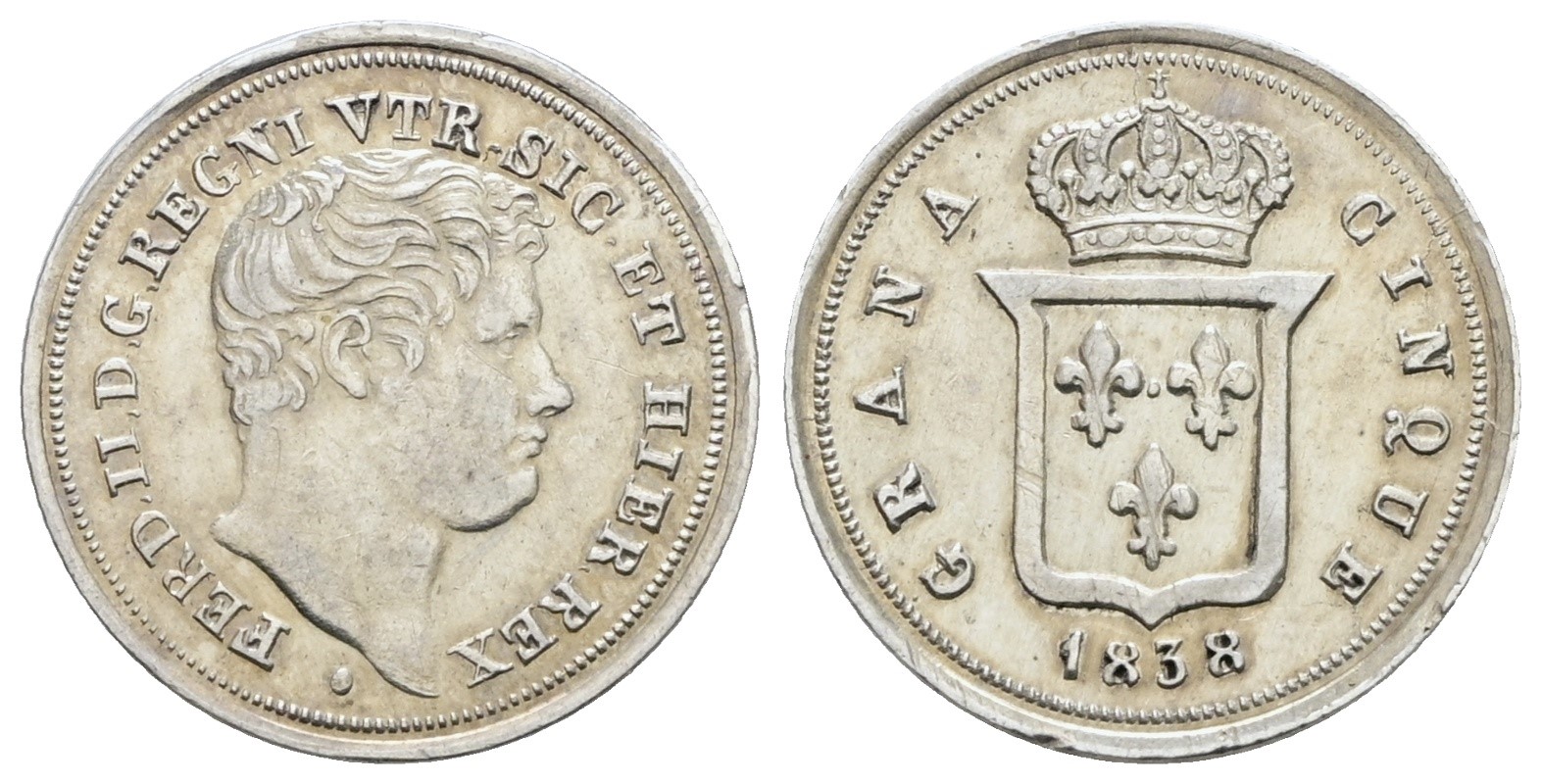 NAPOLI. REGNO DELLE DUE SICILIE. Ferdinando II di Borbone (1830-1859). 5 grana 1838. Ag; 1,15gr; Gig.174; SPL