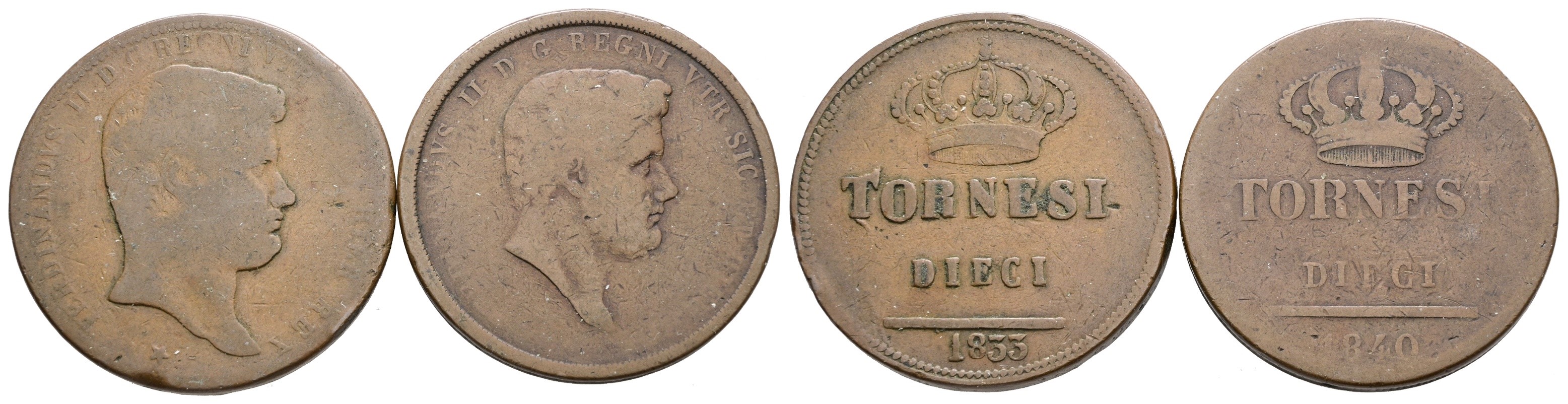 NAPOLI. REGNO DELLE DUE SICILIE. Ferdinando II di Borbone (1830-1859). Lotto di 2 monete da 10 tornesi 1833, 1840. Cu; Conservazioni varie.
