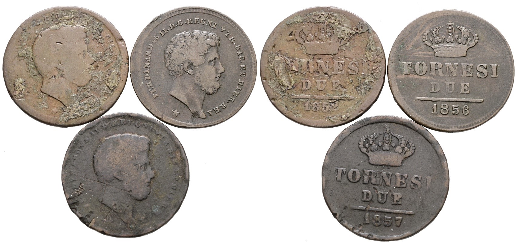 NAPOLI. REGNO DELLE DUE SICILIE. Ferdinando II di Borbone (1830-1859). Lotto di 3 monete da 2 tornesi 1852, 1856, 1857. Cu; Conservazioni varie.
