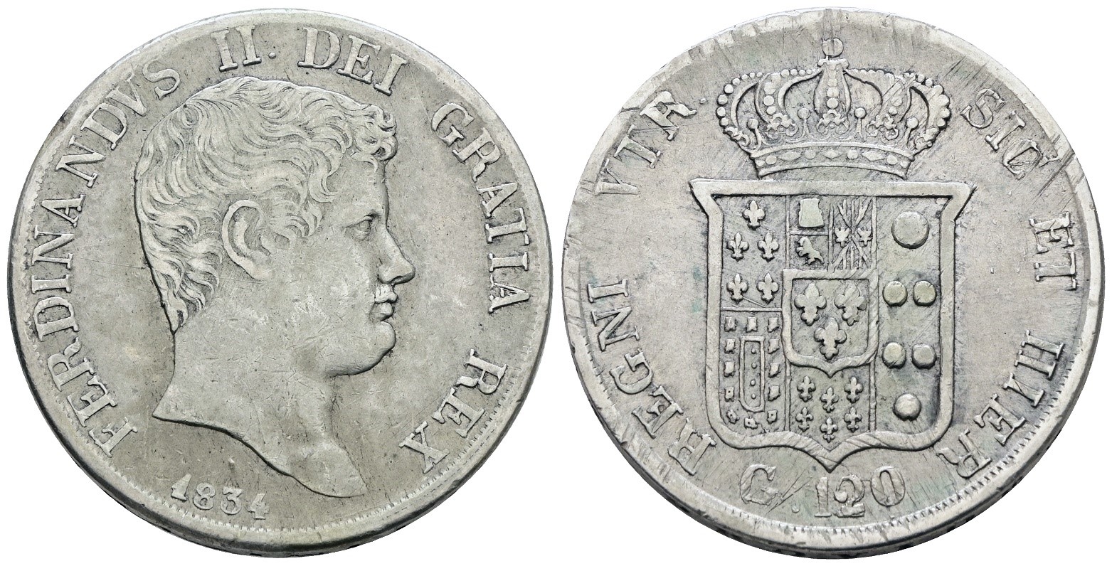 NAPOLI. REGNO DELLE DUE SICILIE. Ferdinando II di Borbone (1830-1859). Piastra 120 grana 1834. Ag; 27,5gr; Gig.58; BB/SPL
