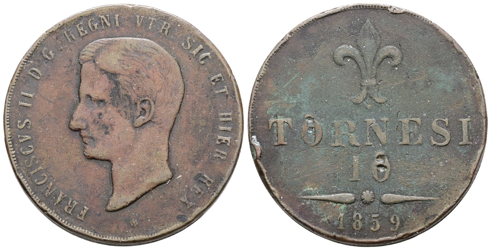NAPOLI. REGNO DELLE DUE SICILIE. Francesco II di Borbone (1859-1860). 10 tornesi 1859 (ROMA - \\\\\). Cu; 31gr; Gig.4b; Raro; MB
