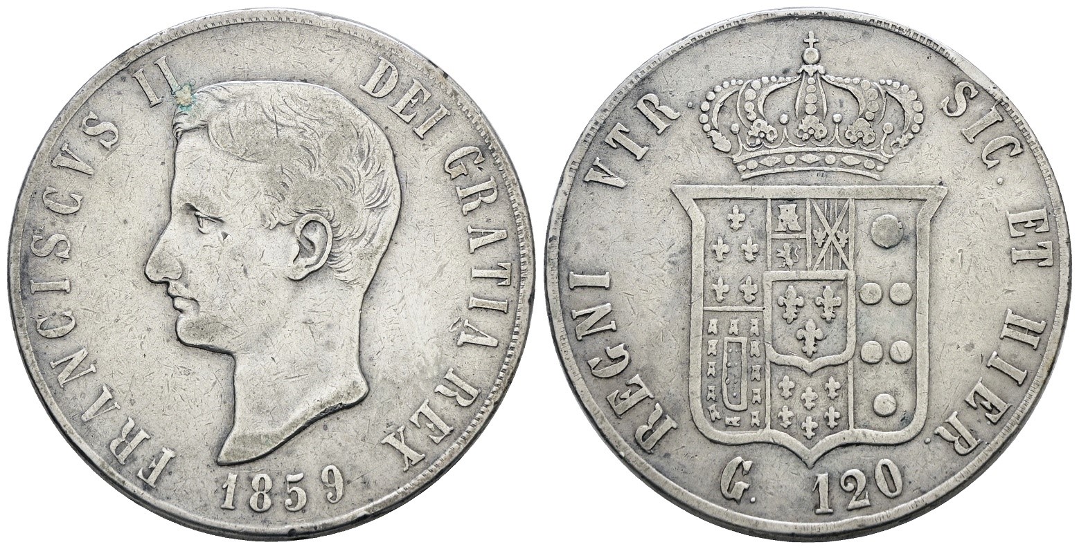NAPOLI. REGNO DELLE DUE SICILIE. Francesco II di Borbone (1859-1860). Piastra 120 grana 1859. Ag; 27,5gr; Gig.1; Q.BB