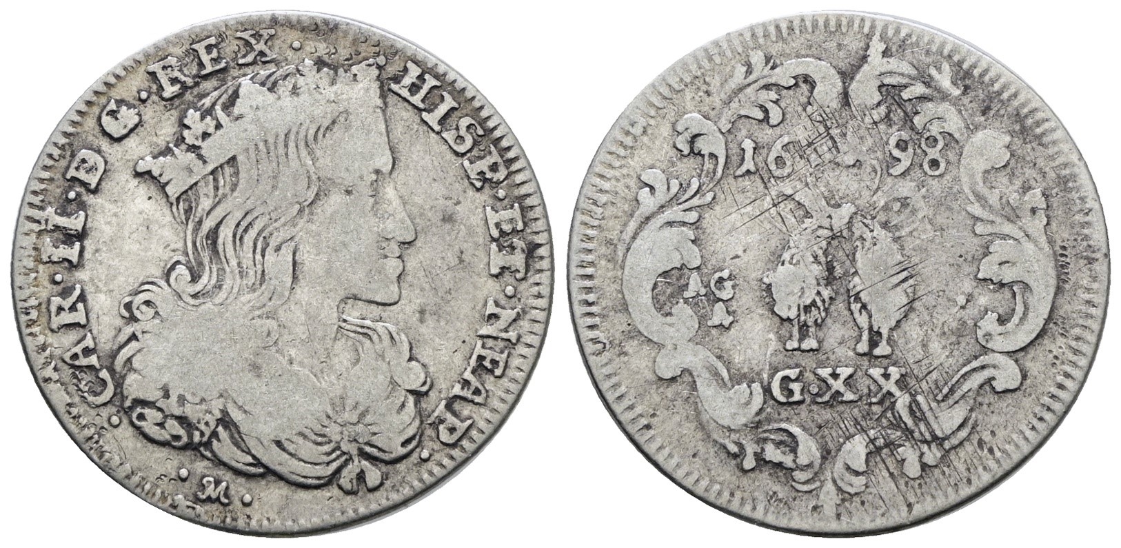 NAPOLI. REGNO DI NAPOLI. Carlo II di Spagna (1665-1700). Tarì 20 grana 1698. Ag; 4gr; P.R.25; MIR 300/7; Raro; MB/BB