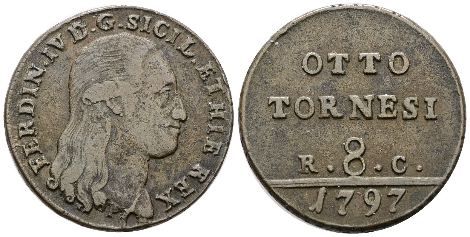 NAPOLI. REGNO DI NAPOLI. Ferdinando IV di Borbone (1759-1799 I per.). 8 tornesi 1797. Cu; 16gr; Gig.115; BB