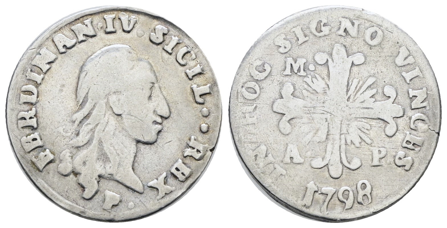 NAPOLI. REGNO DI NAPOLI. Ferdinando IV di Borbone (1759-1799 I per.). Carlino 10 grana 1798 "..". Ag; 2,2gr; Gig.110a; RR; Q.BB