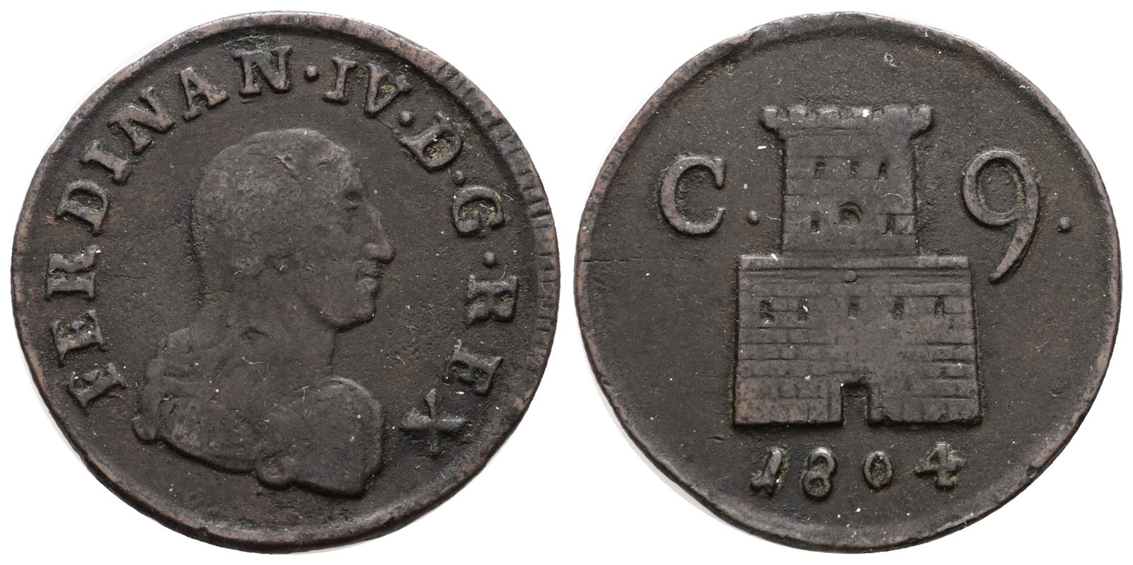 NAPOLI. REGNO DI NAPOLI. Ferdinando IV di Borbone (1799-1805 II per.). 9 cavalli 1804. Cu; 4,7gr; Gig.152; RR; BB