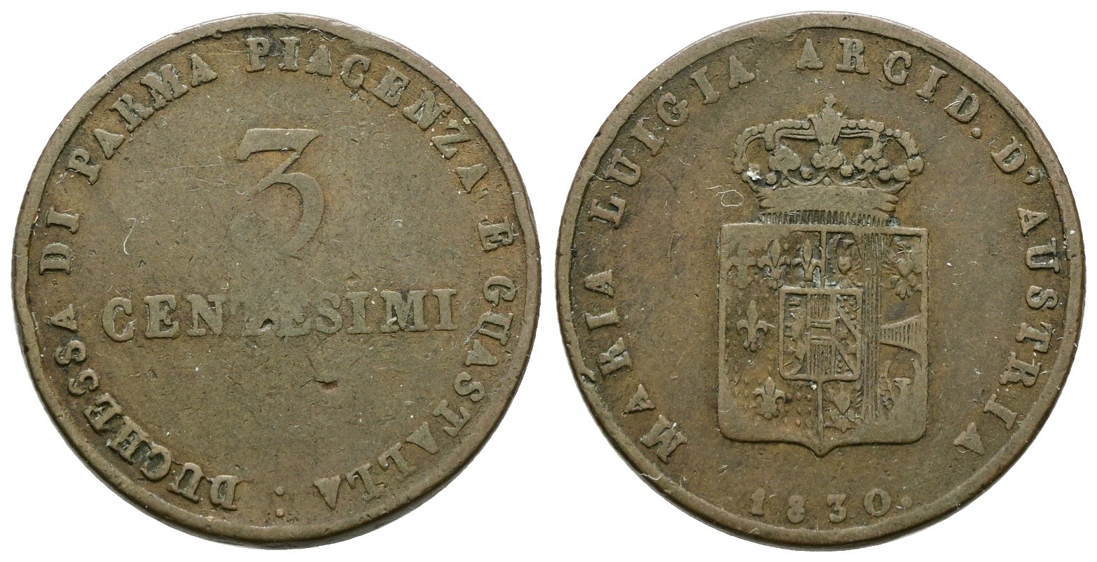PARMA. Maria Luigia d'Austria (1815-1847). 3 centesimi 1830. Cu; 6gr; Gig. 14; RR; MB/BB
