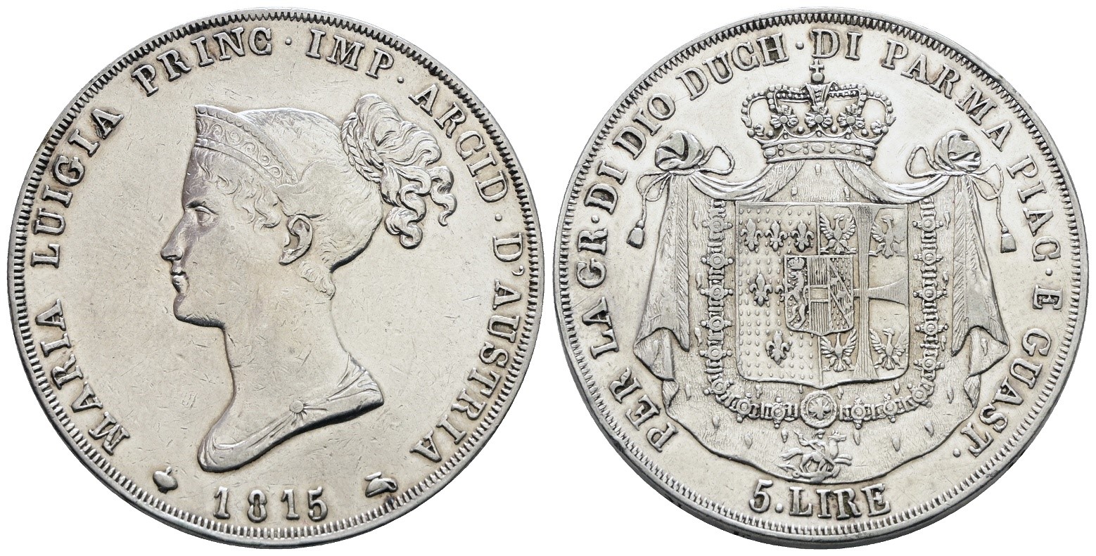 PARMA. Maria Luigia d'Austria (1815-1847). 5 lire 1815. Ag; 25gr; Gig. 5. NC; BB/SPL, colpetti al bordo
