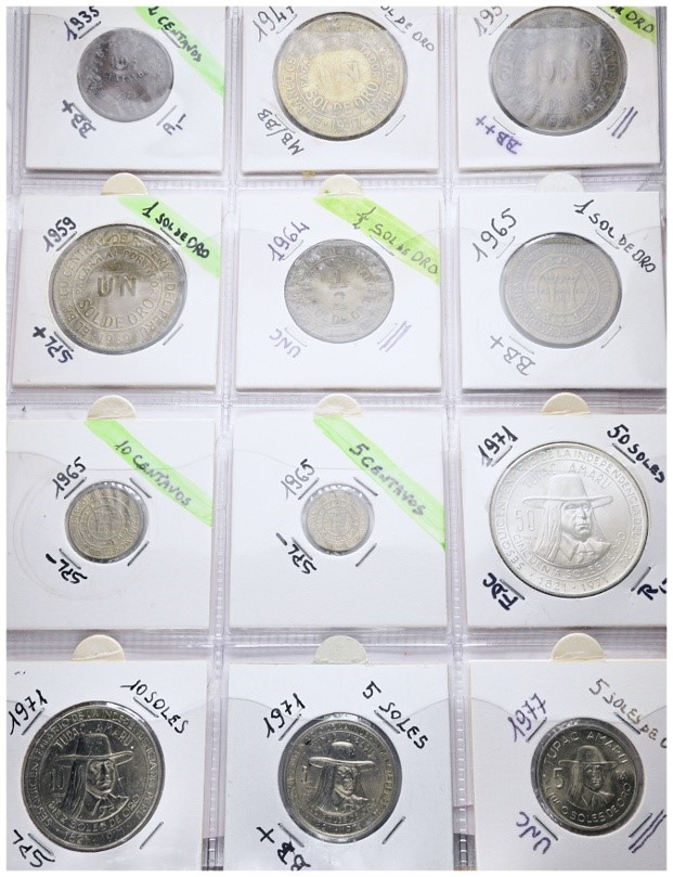 PERU'. Lotto di 12 monete. Nominali, metalli, date e conservazioni varie.