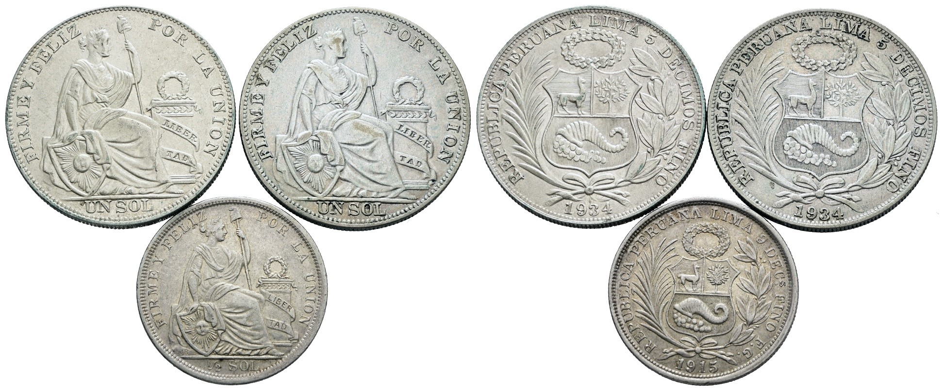 PERU'. Lotto di 3 monete da 1 sol e 1/2 sol. Ag; date e conservazioni varie.