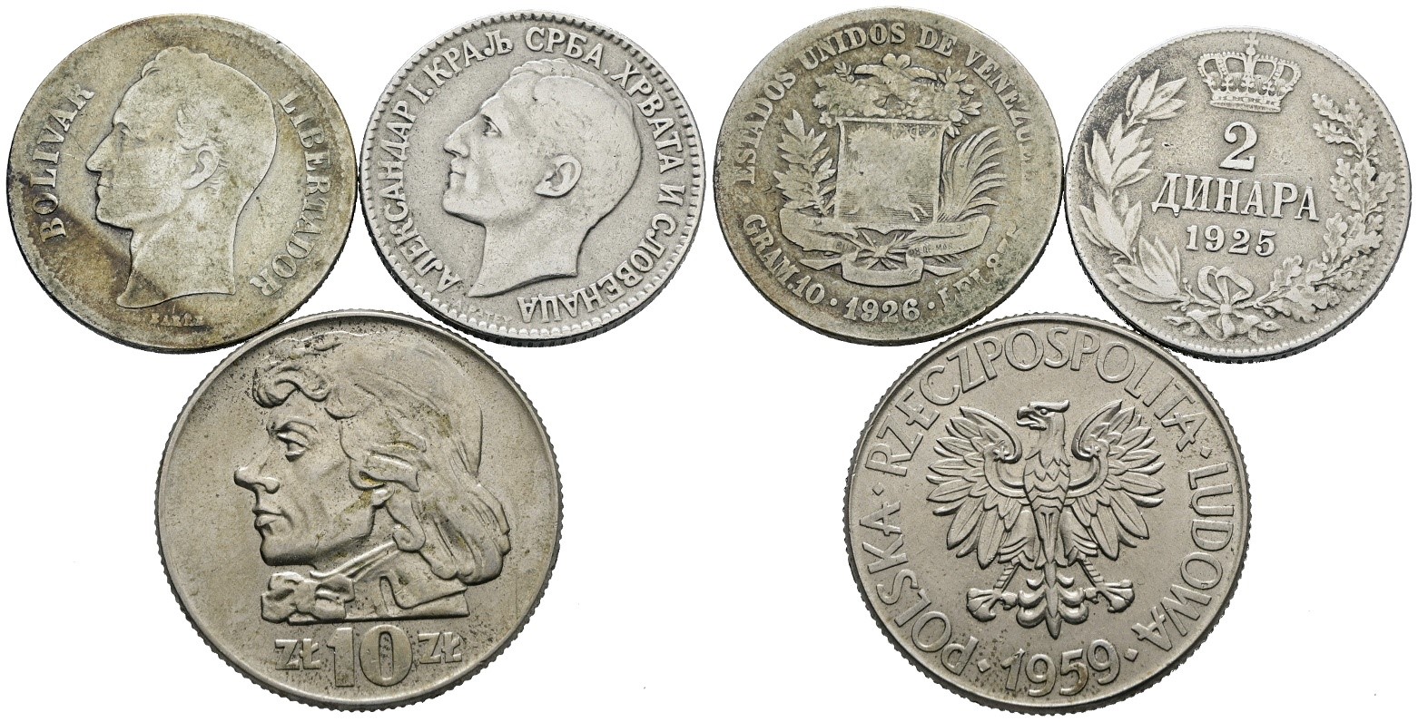 POLONIA - SERBIA - VENEZUELA. Lotto di 3 monete. Ag, Cu; Date e conservazioni varie.