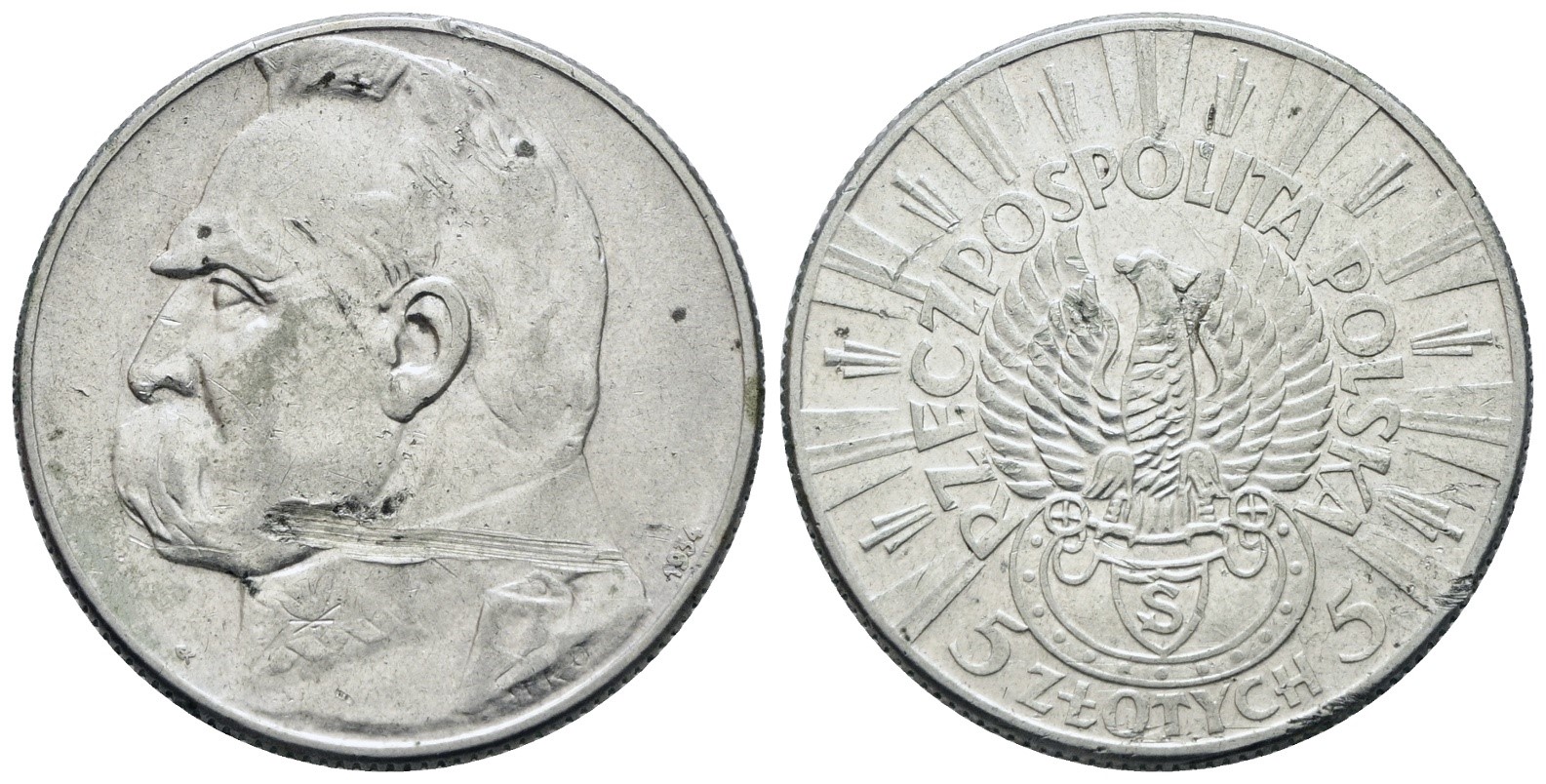 POLONIA. 5 zlotych 1934. Ag; 11gr; C 25; BB, graffio al d