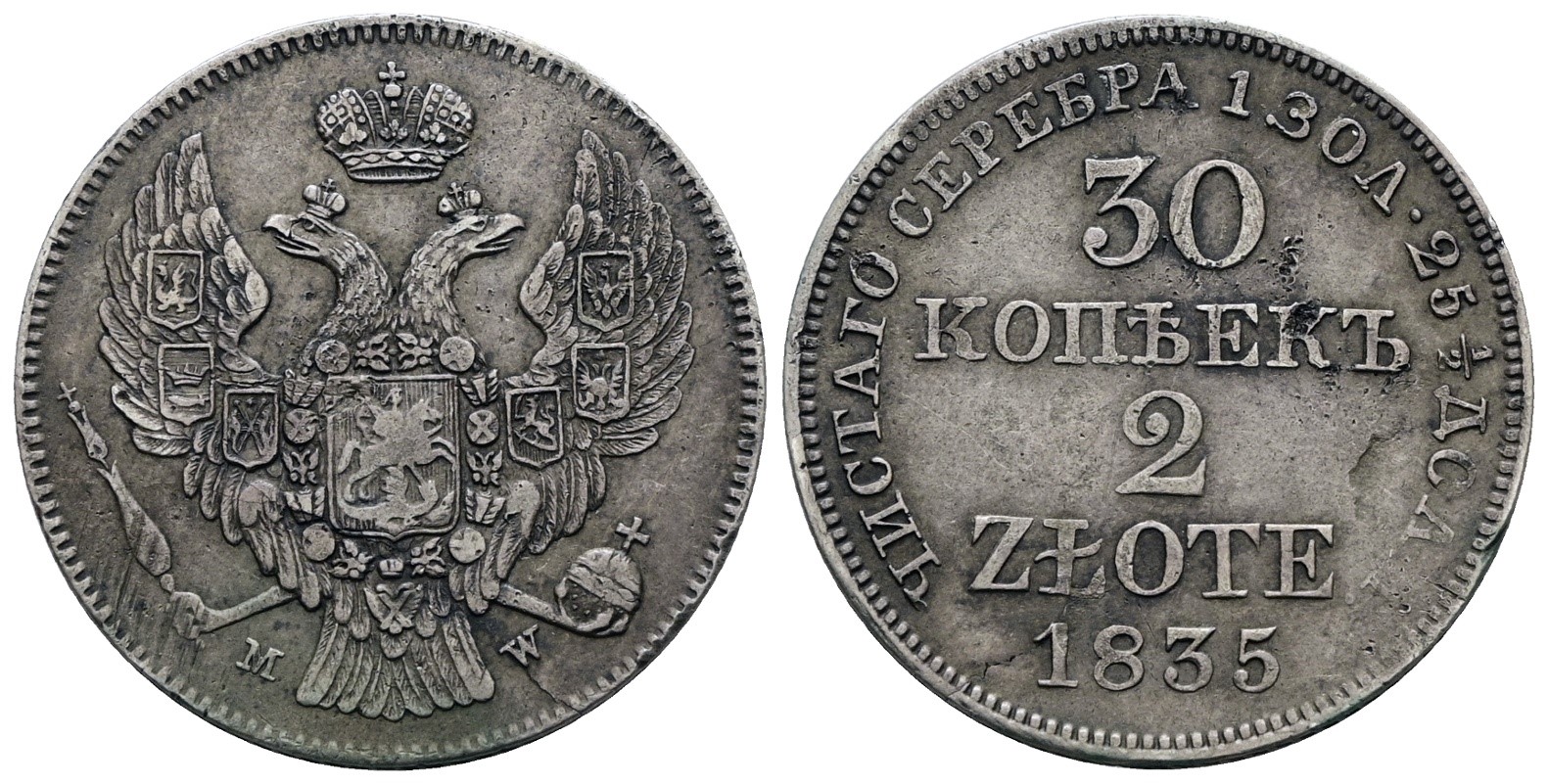 POLONIA. Nicola I (1825-1855). 2 Zlotych - 30 copechi 1835. Ag; 6,21gr; C 132; Raro; BB